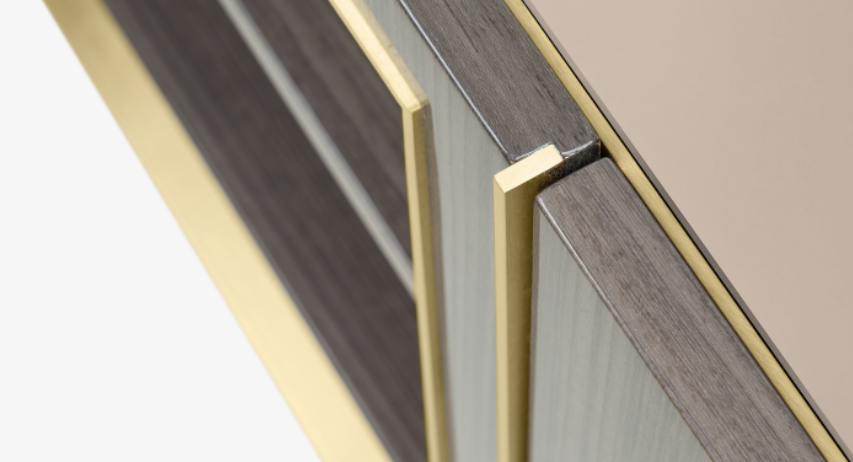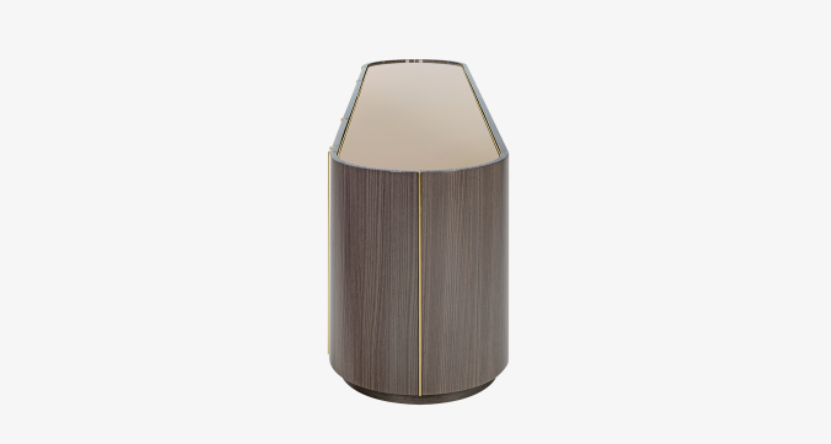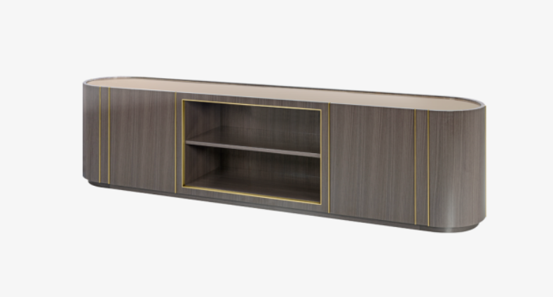 The most streamlined of our low-level TV units, the multi-purpose BERGEN merges two concealed cupboards with open shelves. A sinuous lozenge shape, it's made from wood veneer, brushed brass and features a surface of bronze mirror.