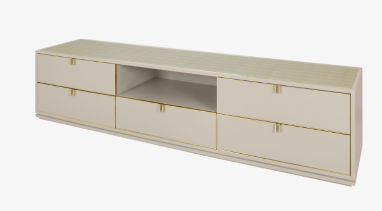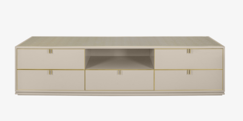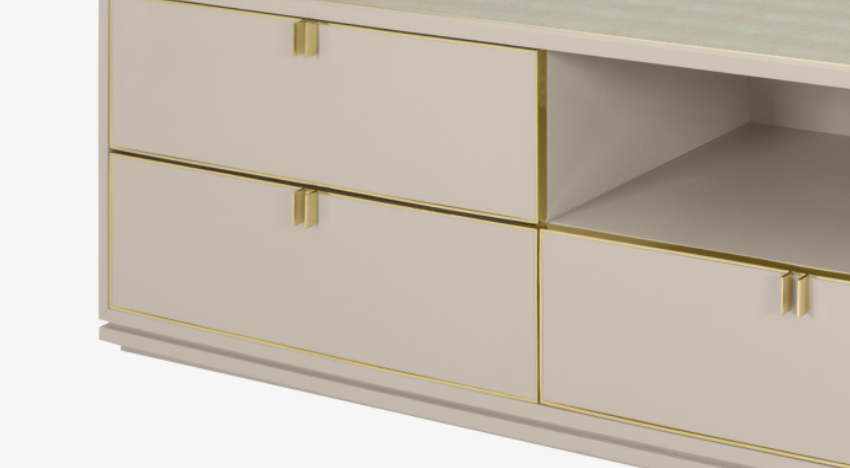 No detail has been left to chance with the streamlined DEVILLE TV unit. Featuring an open shelf for media consoles and five suede-lined drawers, its facade is crafted from lacquered wood and brushed brass, while the surface is inlaid with leather.