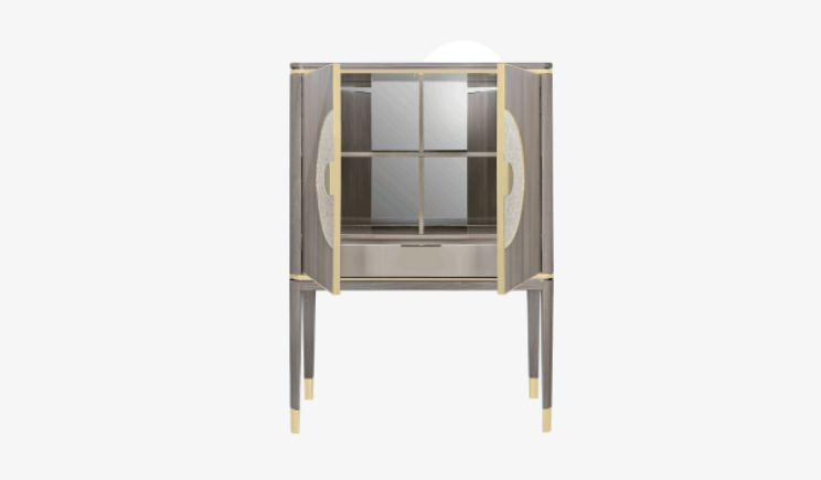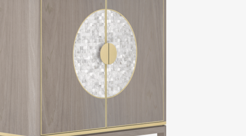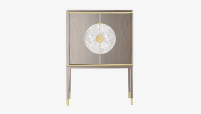 The striking SEVILLE tall cabinet uses elegant materials to elevate a pared-back silhouette. Crafted from glossy wood veneer, details of brushed brass and a circular inlay of white mother-of-pearl catch the light and the eye.