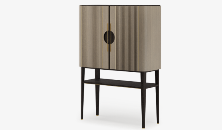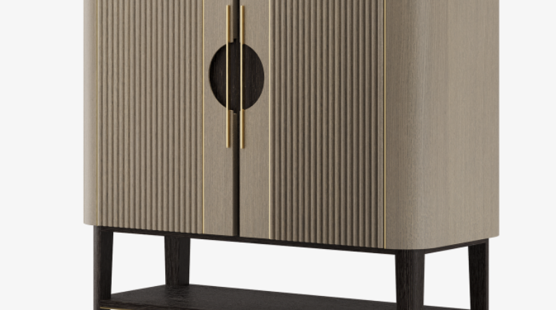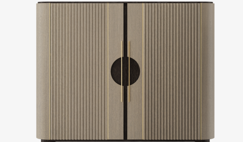 Fluted wood doors highlighted with accents of brushed brass and an open shelf distinguish the TAIPEI tall cabinet, a design with future heirloom aspirations.