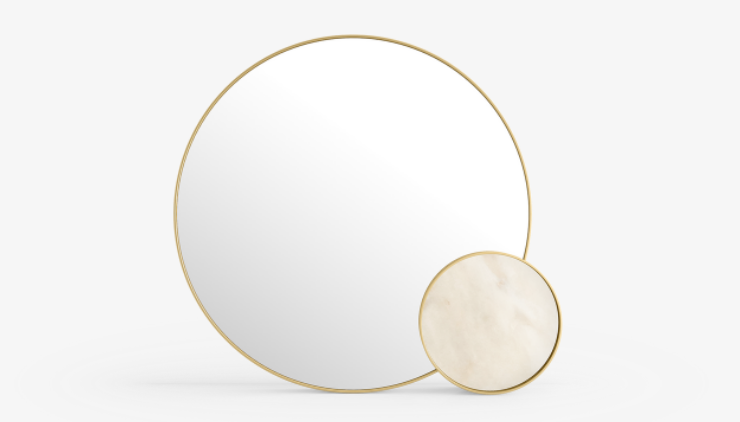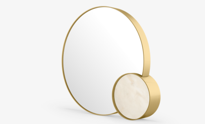 The ergonomic form of the exquisite AMALFI Table Mirror is given an idiosyncratic sensibility with the addition of a smaller overlapping circle inlaid with marble. A seamless brushed-brass trim delivers a flawless finish, bringing harmony to the whole.