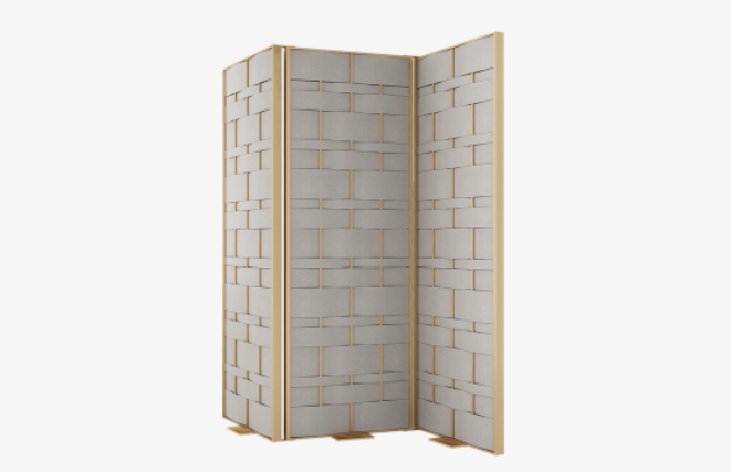Create zones and privacy within a large or open-plan space with the CAPRICE screen. A versatile piece that can be easily rearranged, it features a frame of brushed brass woven with alternating rows of wide and narrow strips of leather.