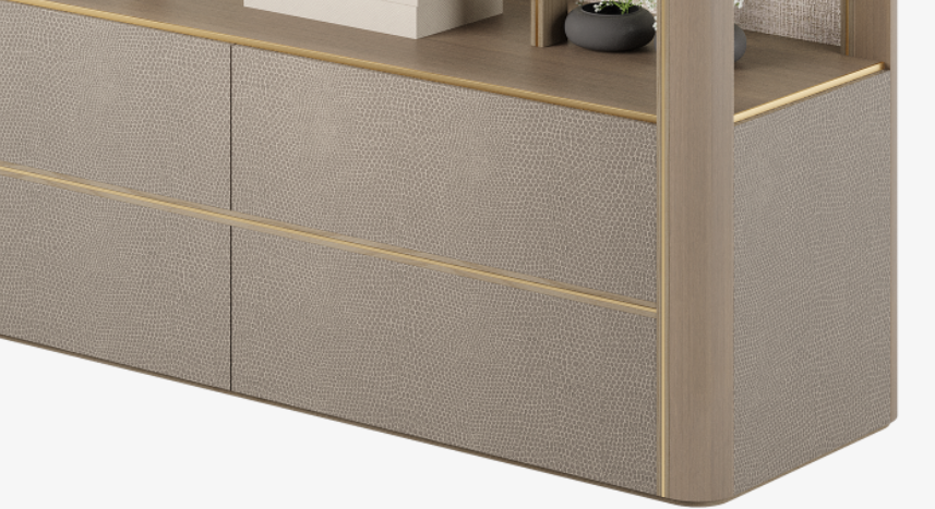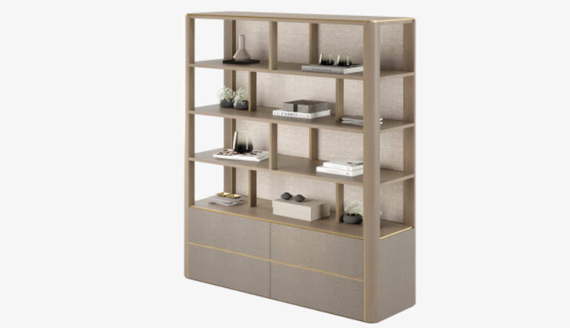 The latest addition to our best-selling KENT family of furniture designs, this brand-new bookcase continues the collection's clean-lined aesthetic with open wooden shelves and handle-free drawers finished with textured faux leather.
