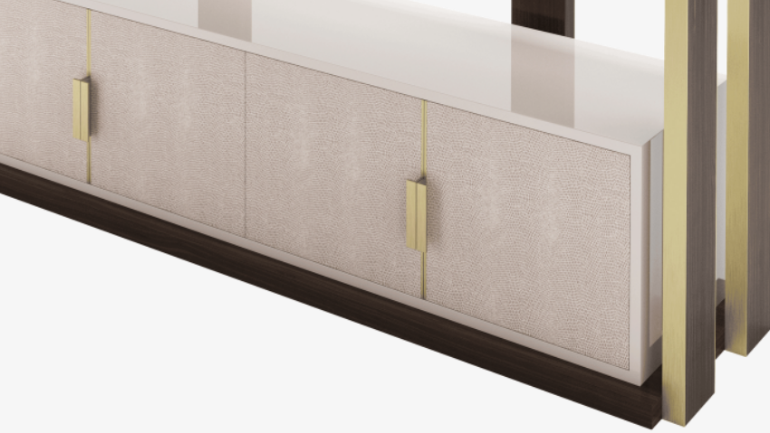 The impactful NAPIER Bookcase fuses an angular silhouette with a maximalist material blend. Featuring a framework of dark wood veneer with metallic accents, it incorporates leather-covered doors with brushed-brass handles and open shelves made from glossy lacquer.