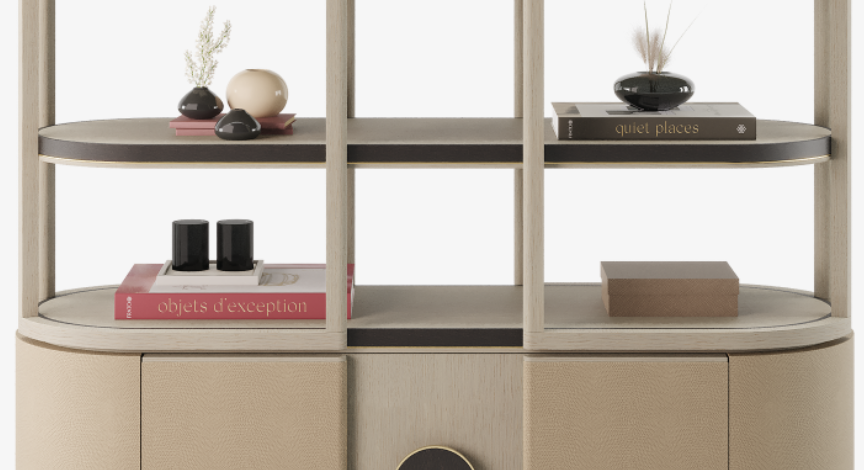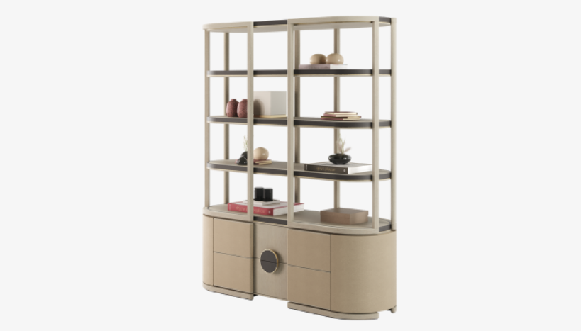 Chic details, from the solid wood supports and veneer shelves, to the leather-fronted suede-lined drawers and oversized circular handle, add a pleasing sense of symmetry to the NEW ORLEANS bookcase. Designed to be appreciated from every angle, it can also be used as a room divider.