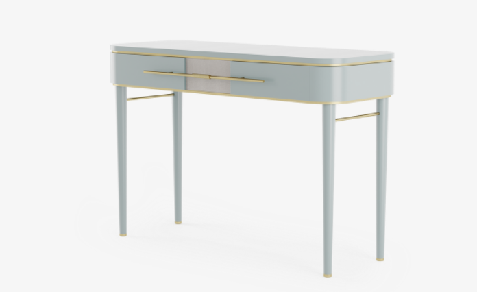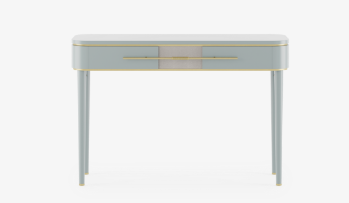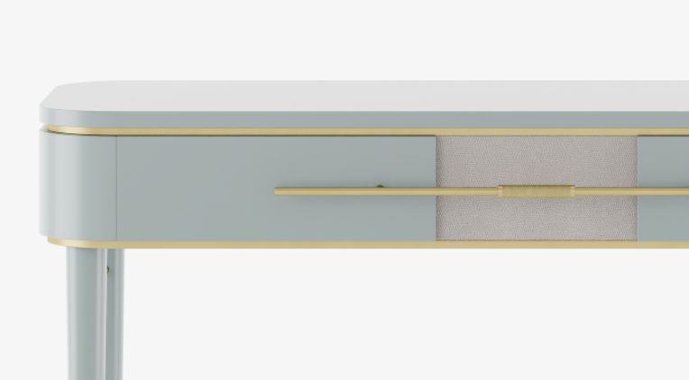 Powder blue lacquered wood distinguishes the delightful AGRA dresser, which features brushed and knurled brass details and a single, elongated drawer with leather inlay. Additionally, slender, tapered allow for a chair or stool to slot beneath.