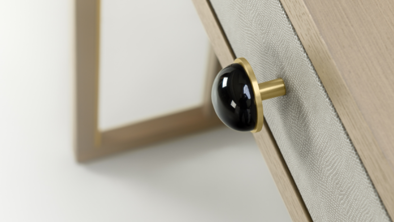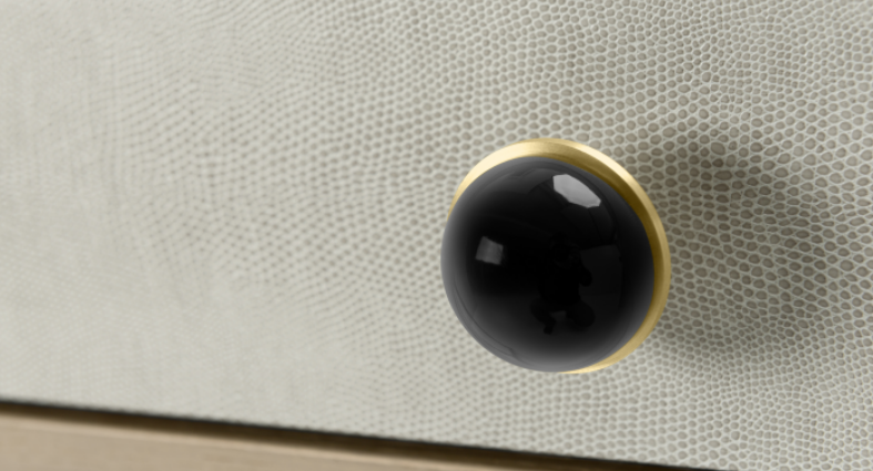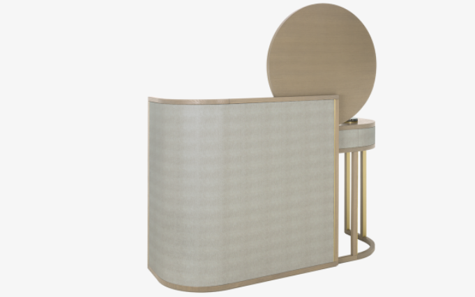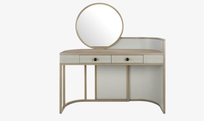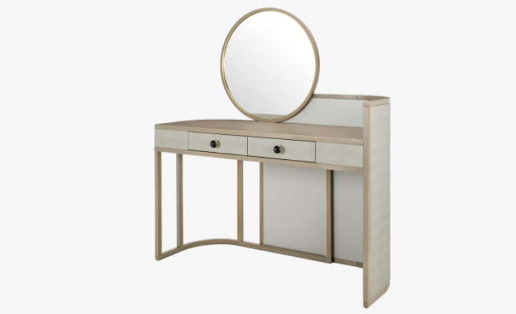 One of our most admired dressers, the stylish PARMA accessorises a crescent-shaped silhouette with a circular mirror, leather-covered surround, two drawers with gem-like handles and brushed-brass trimmings.