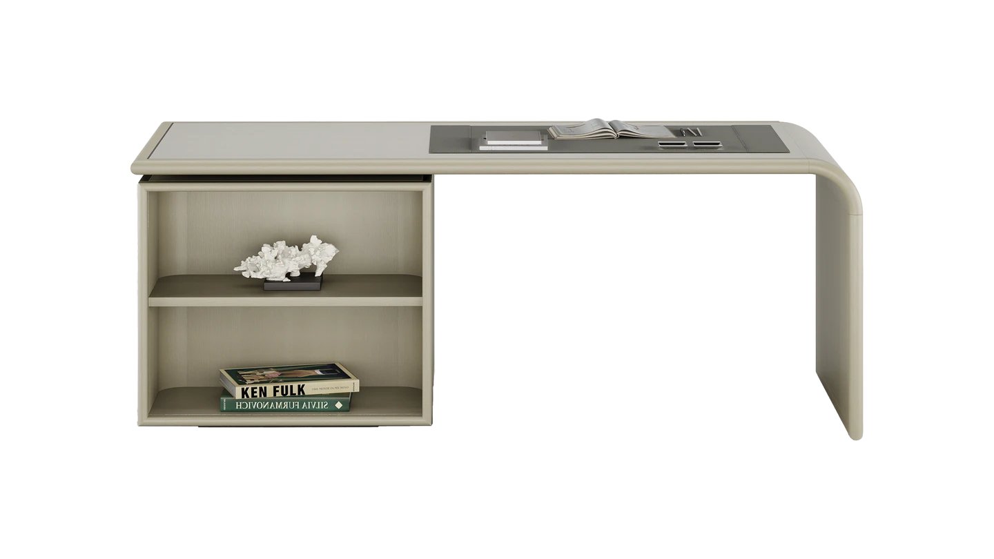 Vintage meets modern in our HATTA Desk, which combines a smooth curved shape with practical shelving. It’s crafted from satin open-pore wood and features leather, suede and stainless steel details.
