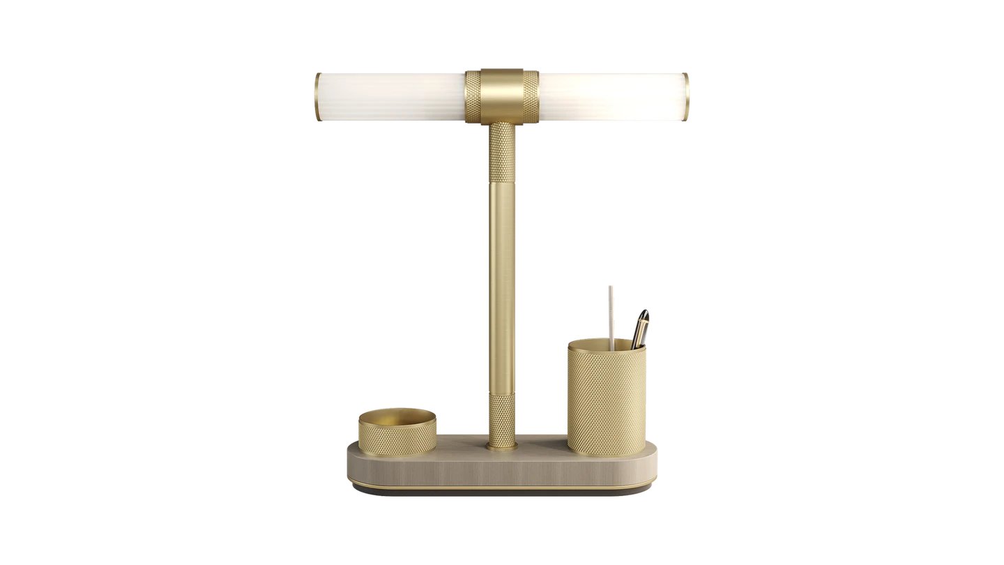 "With its demure yet unique shape, the IRUYA Table Lamp adds a statement finish to your home office. Its constructed from wood and brushed brass accents with an opaline shade for a sophisticated finish. "
