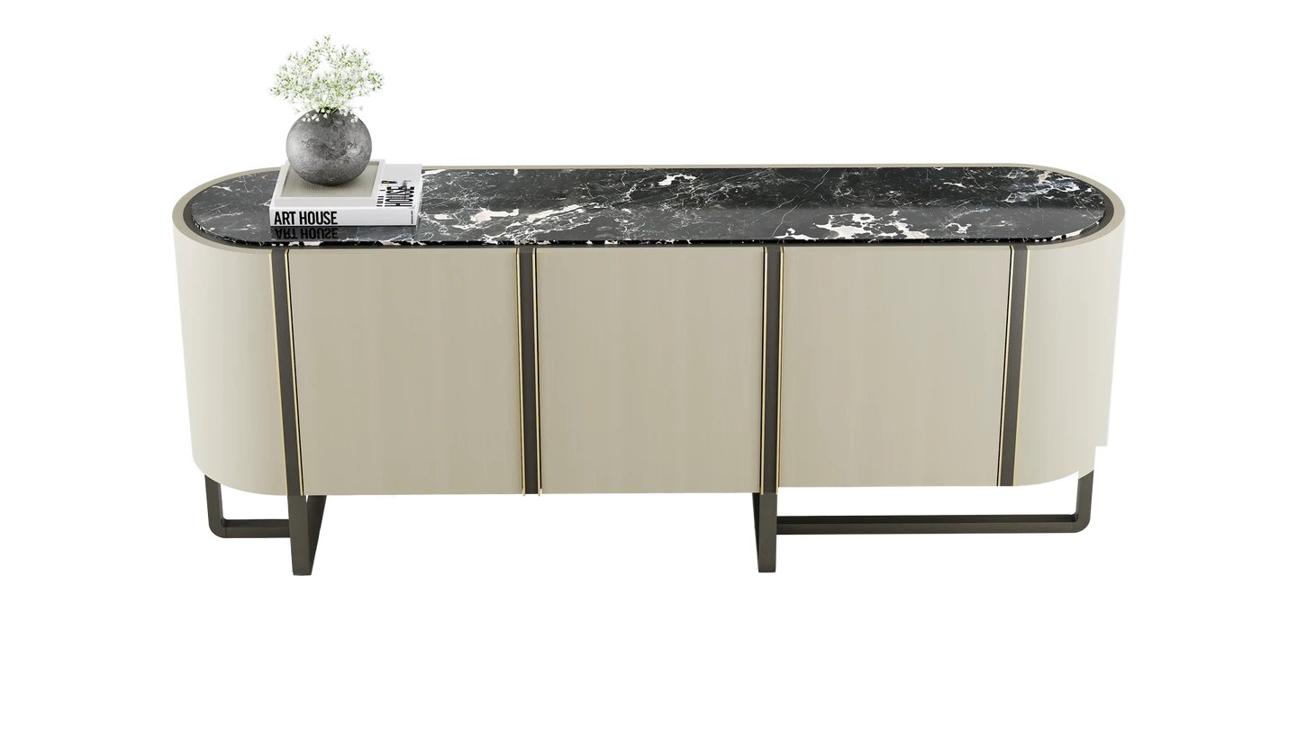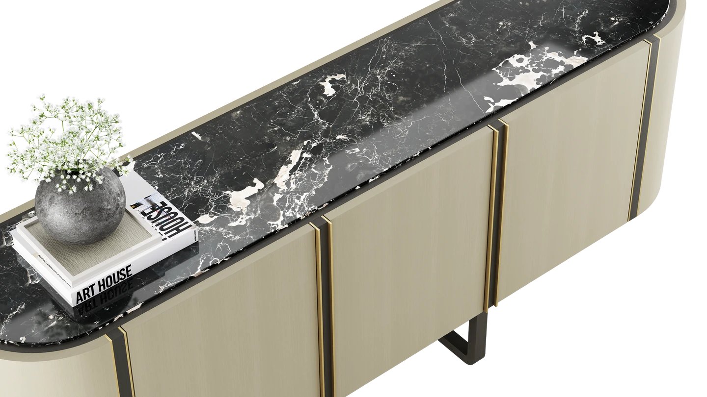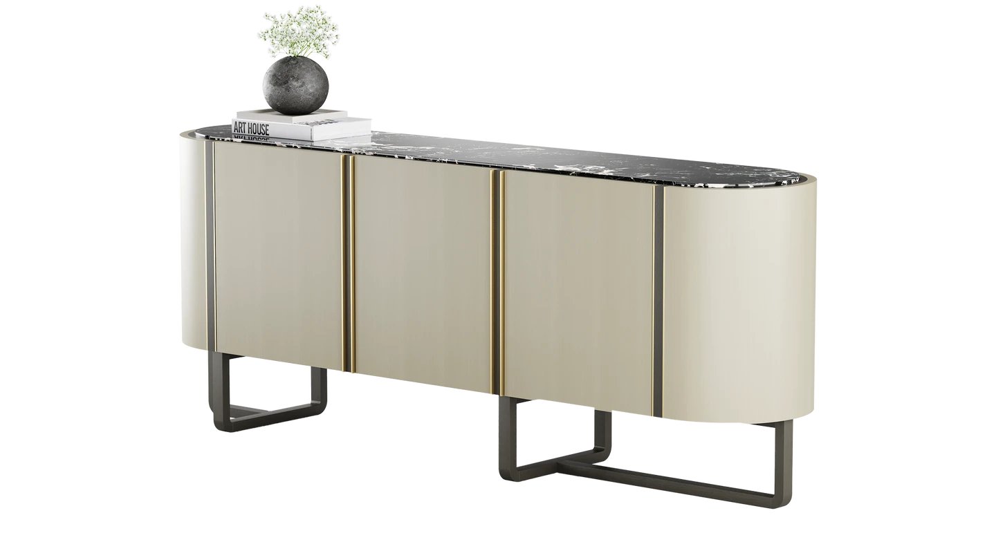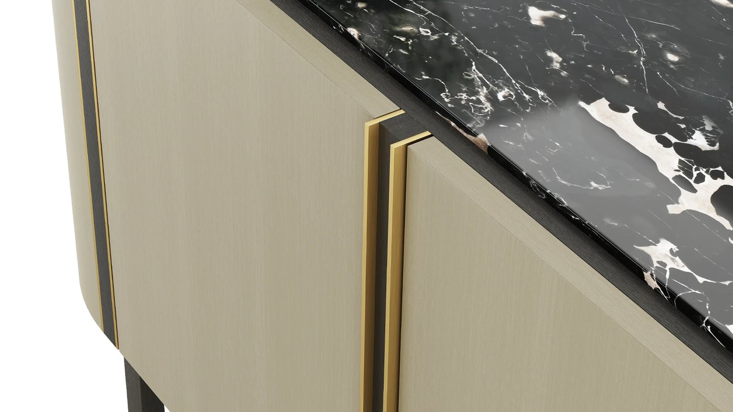 Combining cupboard and shelf space, the NASHUA II Sideboard is an elegant staple for your lounge or dining room. It's finished with stone inlay and brushed brass accents for an effortlessly sophisticated look.