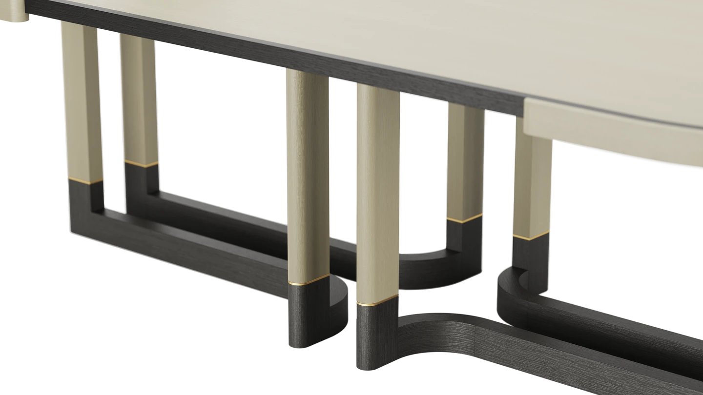 "The STOWE Dining Table takes centre stage thanks to its commanding form. The solid wood structure is amplified by soft details such as subtly curved legs and brushed brass highlights. "
