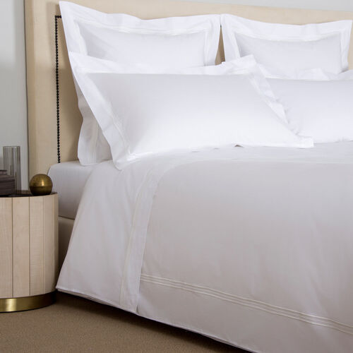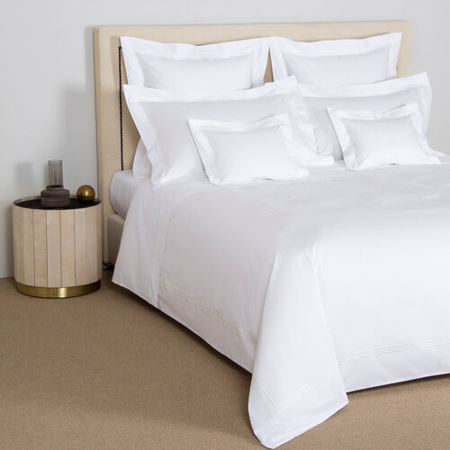 The Triplo Bourdon Duvet Cover is crafted from smooth cotton poplin and has a remarkable sheen and brightness and finished with a three-line embroidery. 100% cotton. Made in Italy.