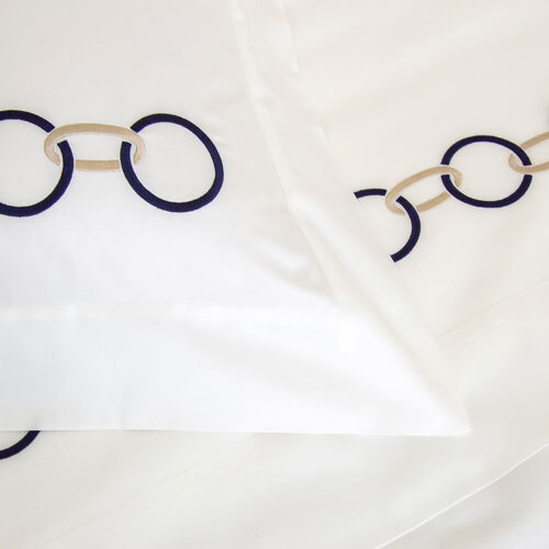 Featuring a intricately embroidered dual-tone chain design on the top sheet and shams, the Links Embroidered Sheet Set brings elegance to any master or guest bedroom. This sheet set includes a top sheet, two shams, and a bottom sheet in pure long-staple cotton sateen. 100% cotton. Made in Italy.