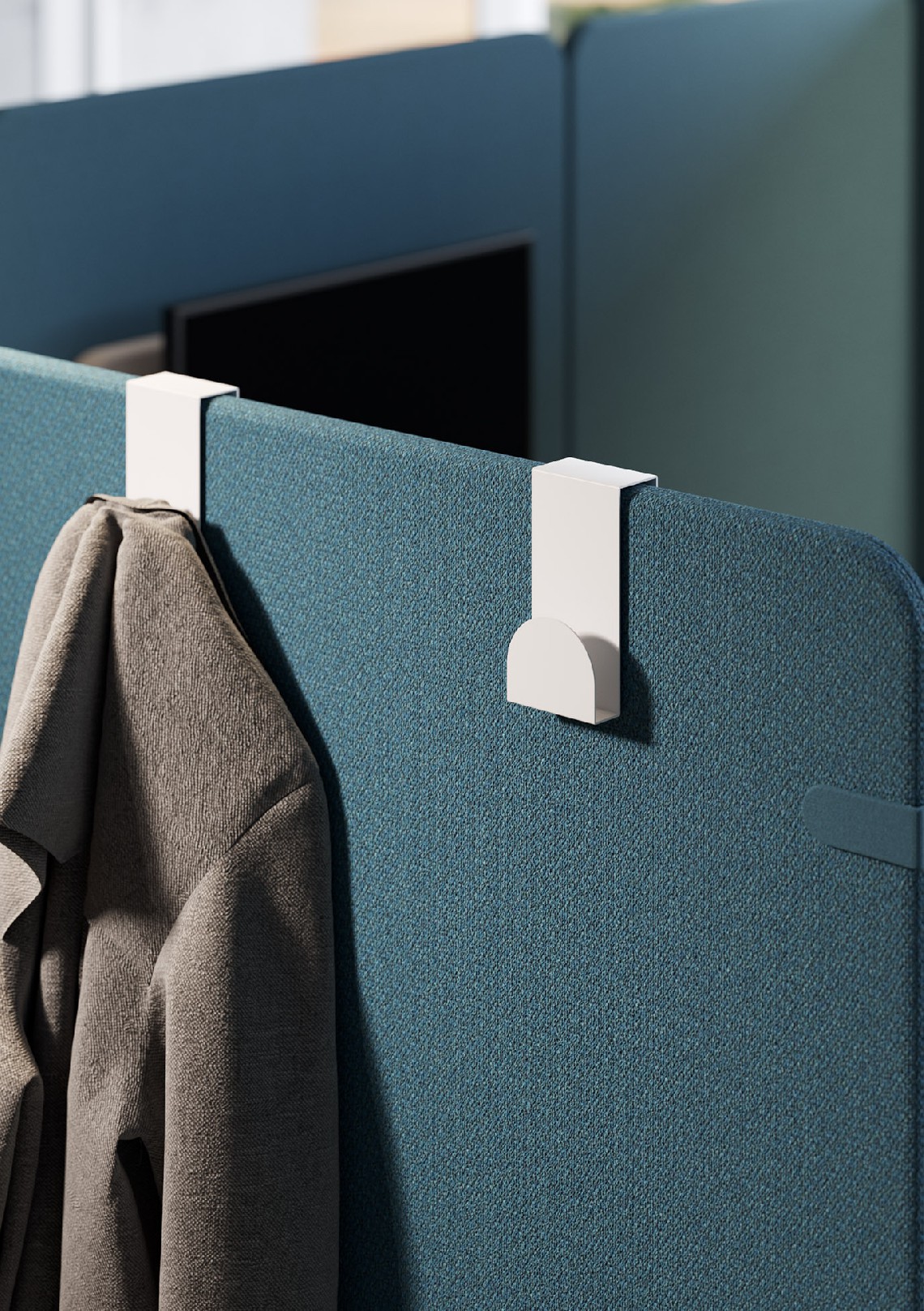 Inoltre, la possibilità di determinare spazi riservati attraverso l’aggancio di pannelli divisori allo schienale della seduta, permette di ritrovare uno spazio privato ed acusticamente protetto dove concentrarsi anche all’interno di ambienti workspace.