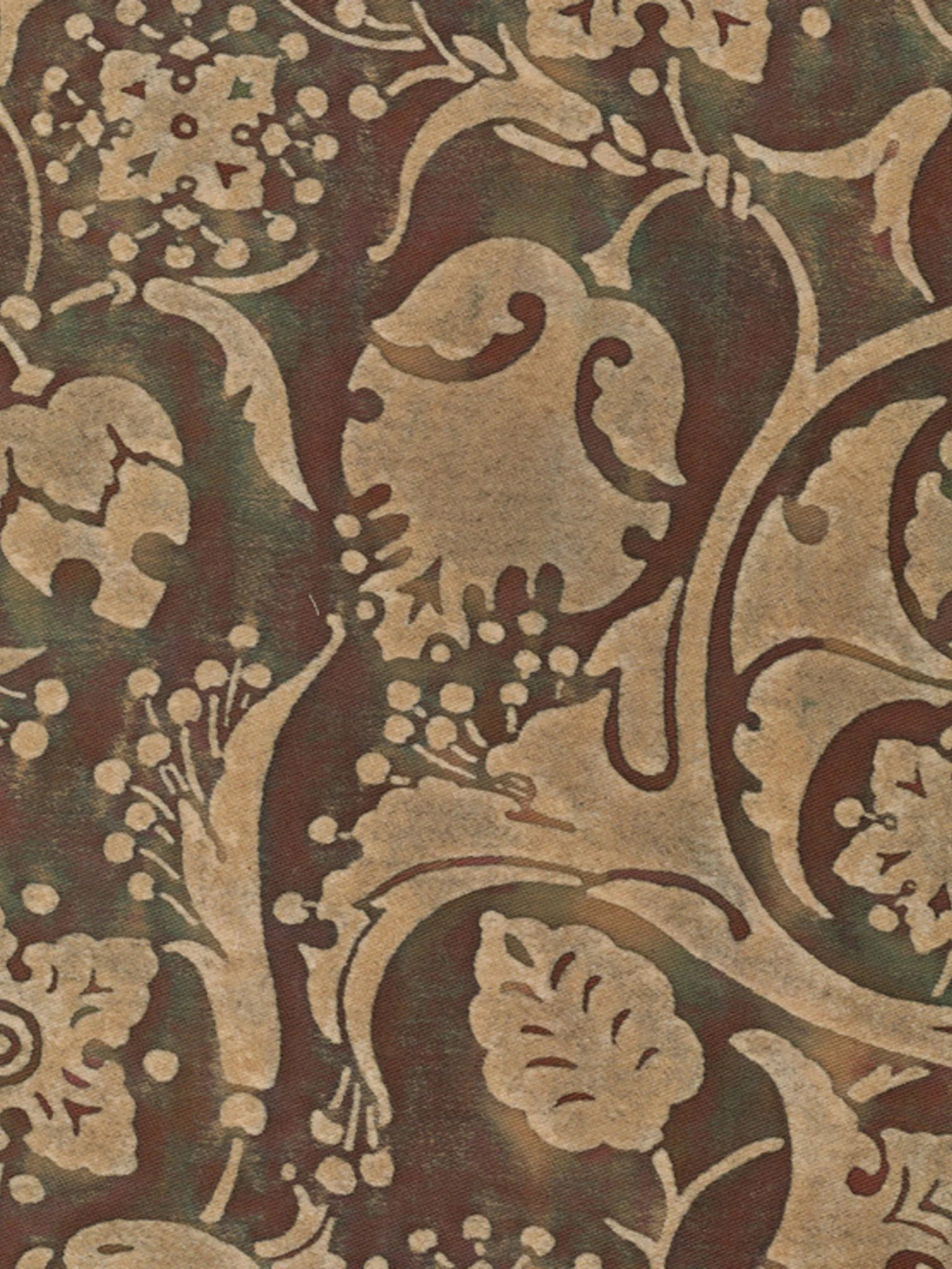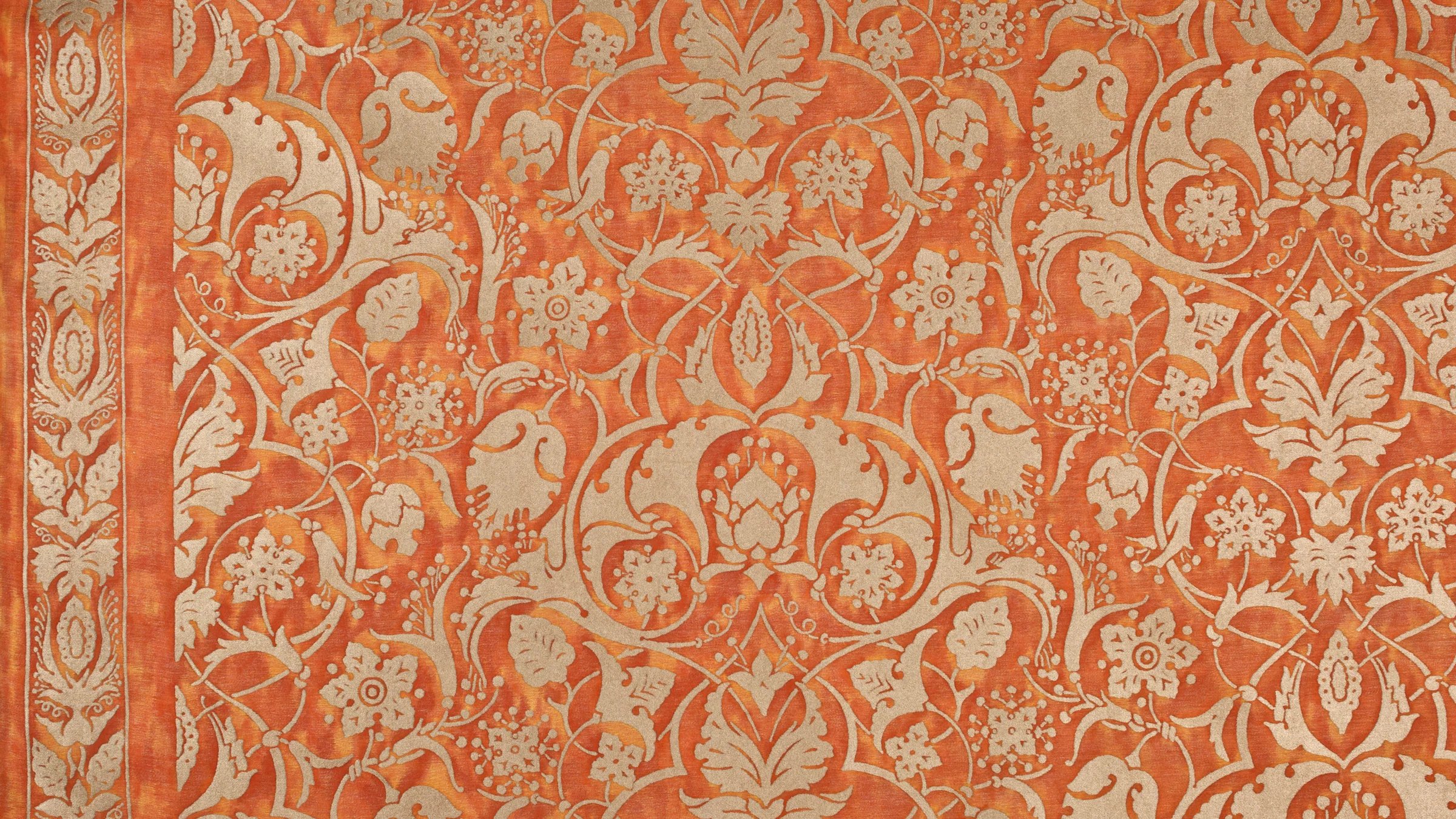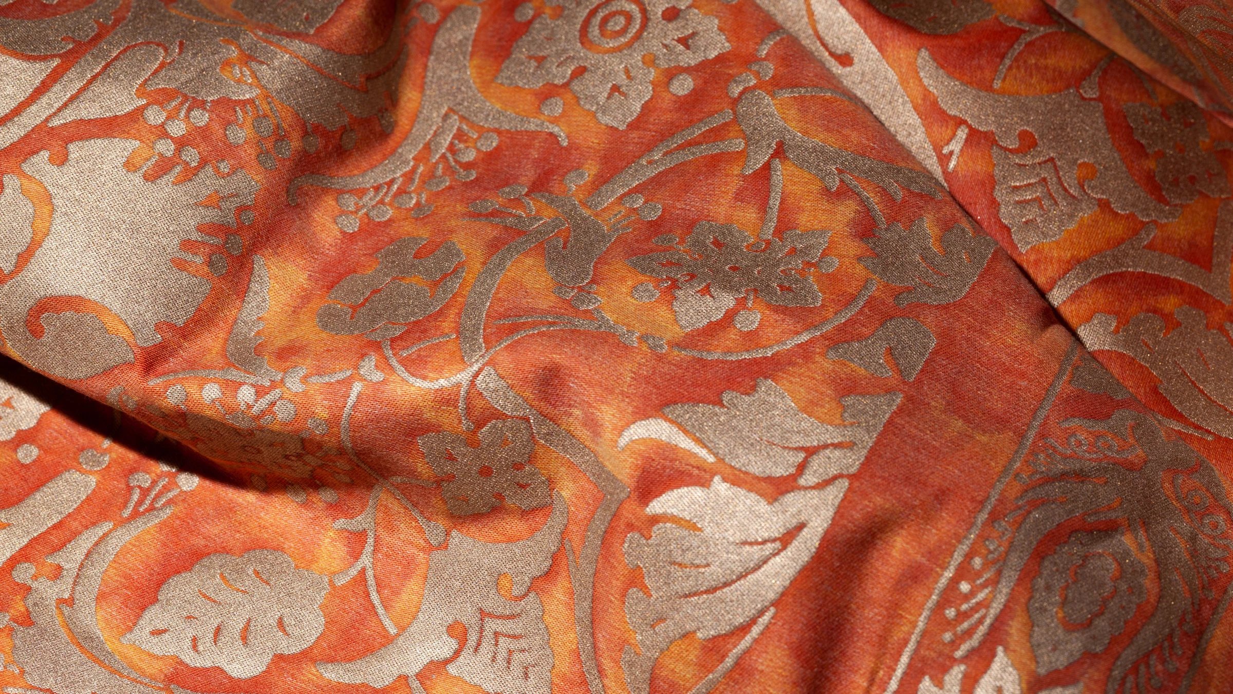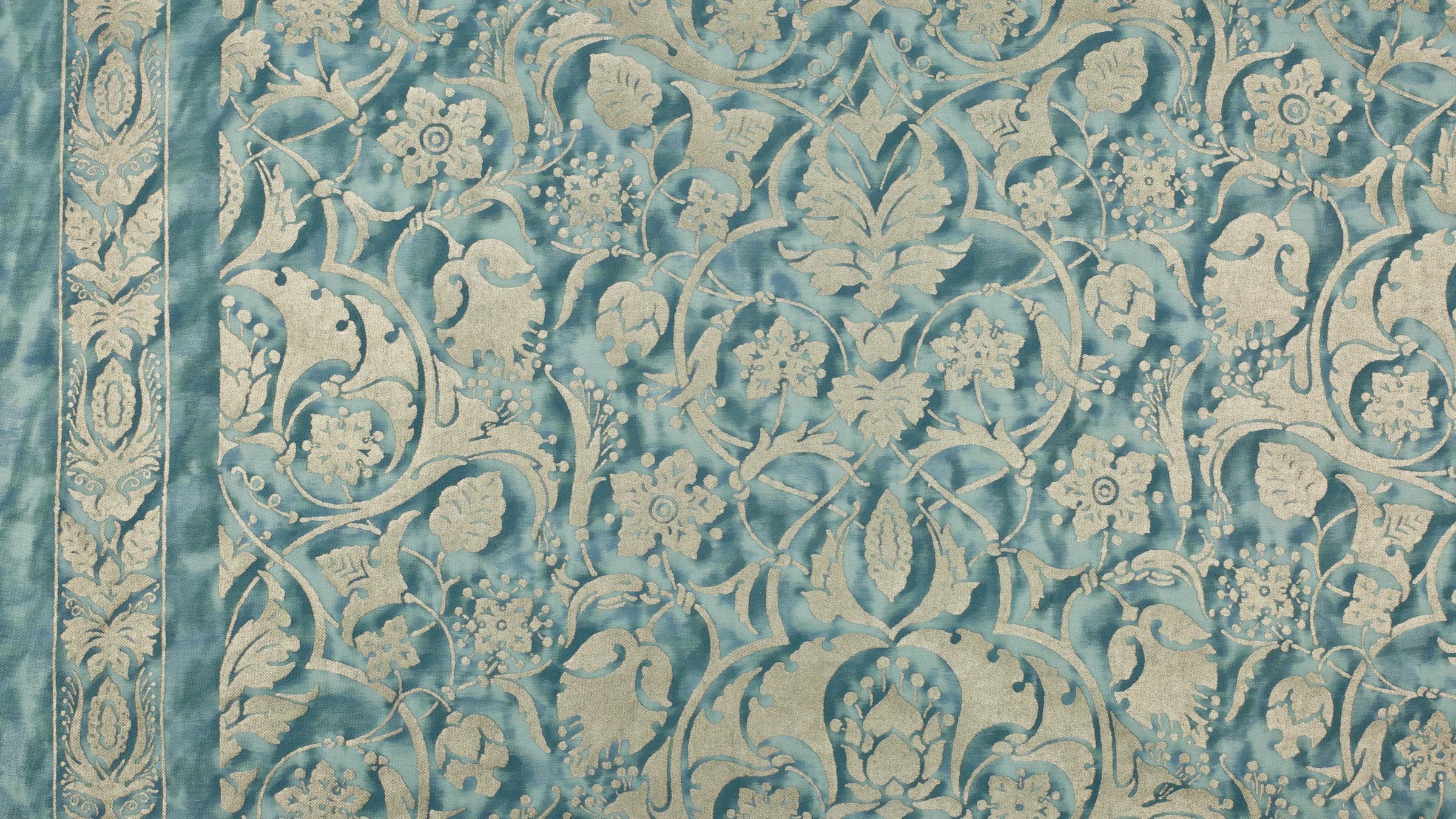 The Paris of Mariano Fortuny’s childhood was filled with excitement and intrigue, as vivid depictions of PERSEPOLIS’s ancient city were first published in Voyages en Perse de MM. Eugene Flanin peintre et Pascal Coste architecte, including over 350 revolutionary illustrations of the ruinous city. PERSEPOLIS, the ceremonial capital of the ancient Persian empire built by Darius the Great, continued to captivate Mariano Fortuny’s imagination years later, inspiring this whimsical and spirited pattern filled with sensual Persian floral, leaf, and pomegranate motifs.