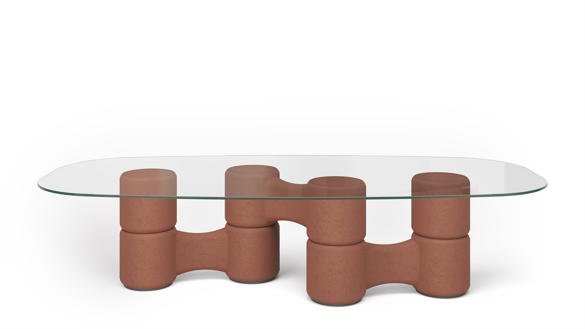 Tavolo con piano in cristallo trasparente temperato 15mm. Base formata da cilindri in legno spatolati a mano. Disponibile nei colori mattone, corda, carbone o avorio.