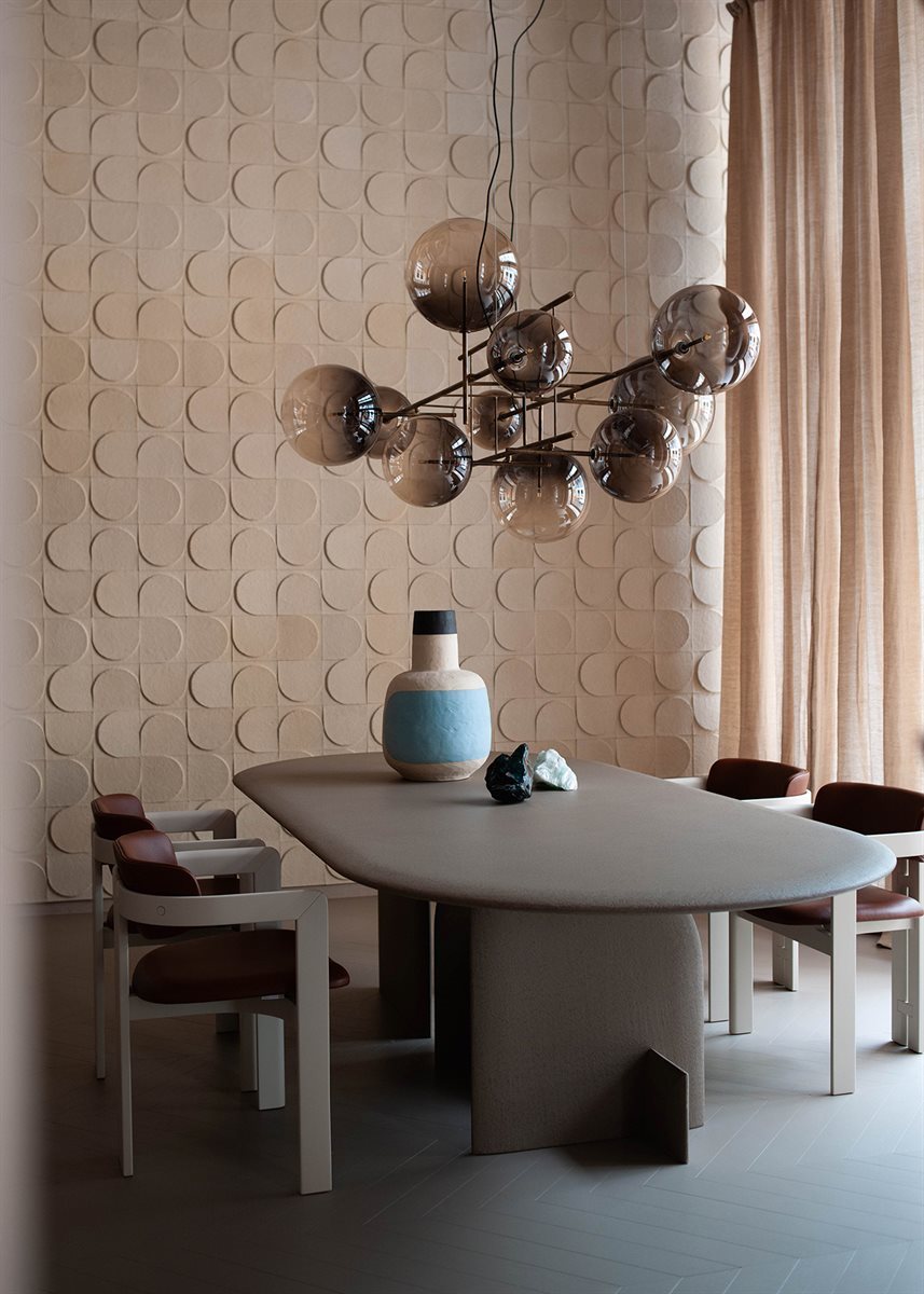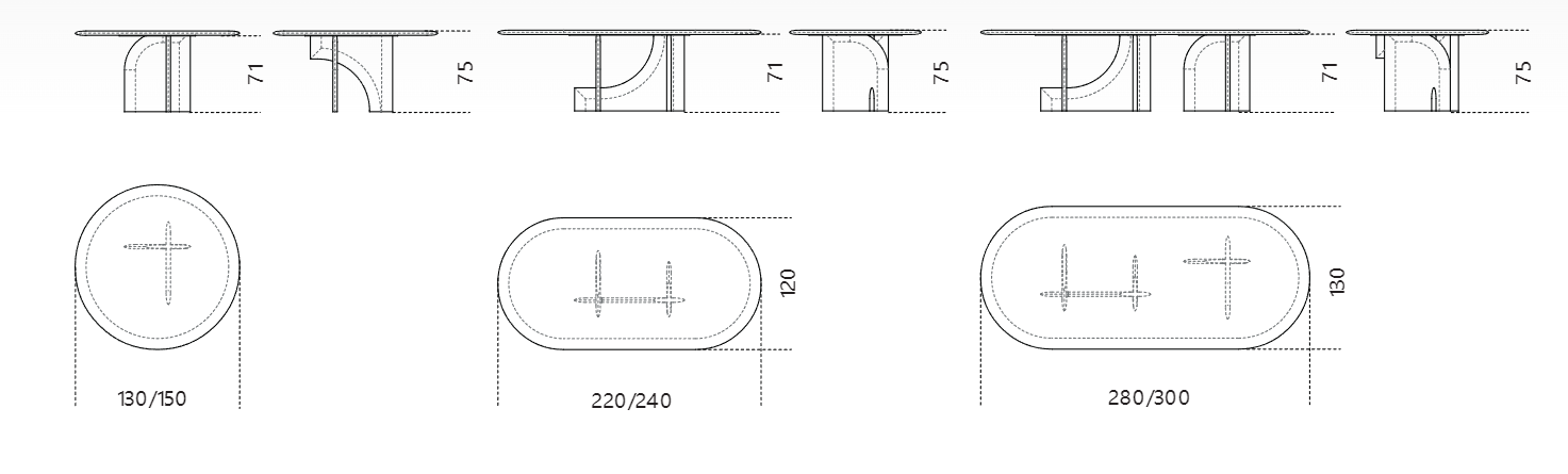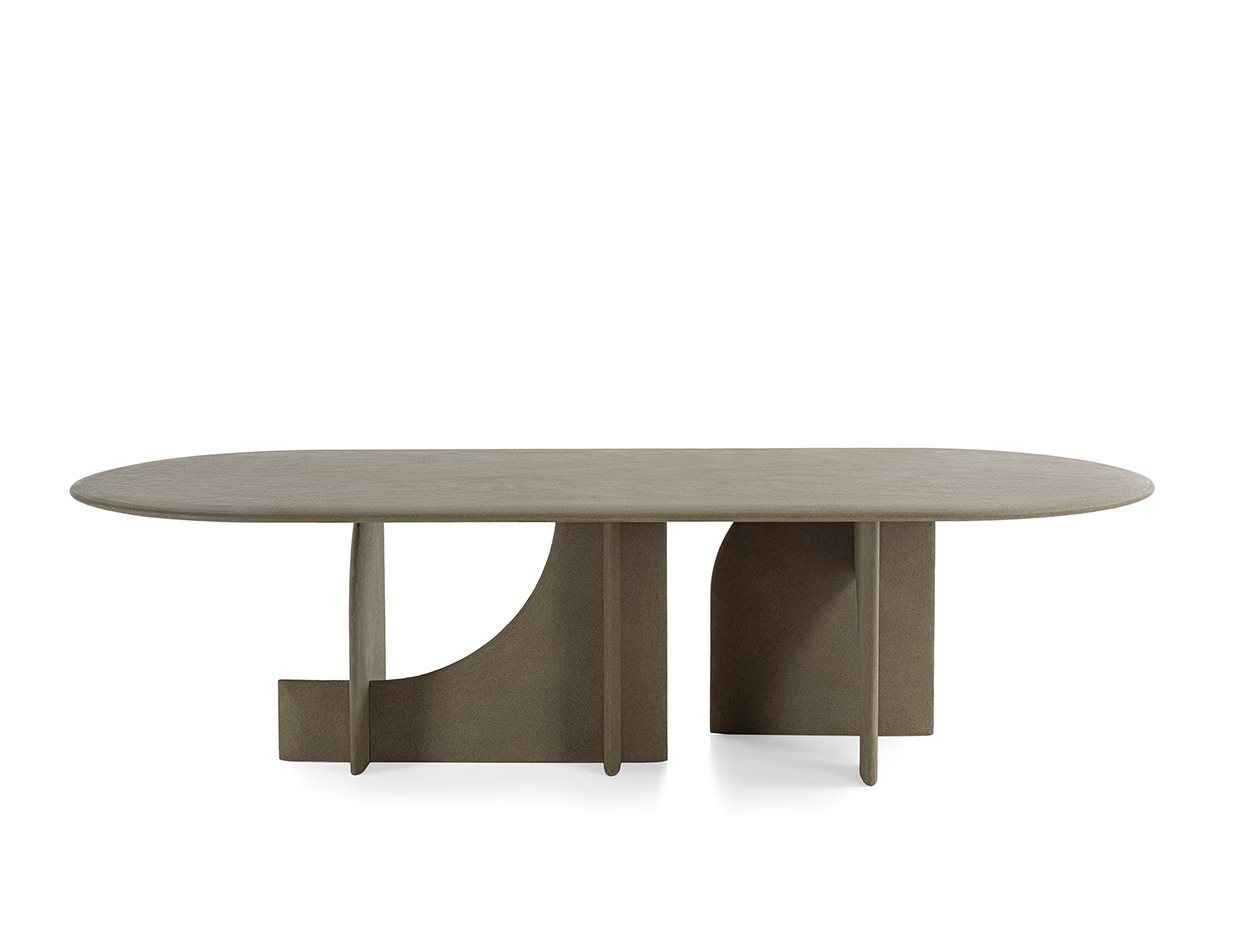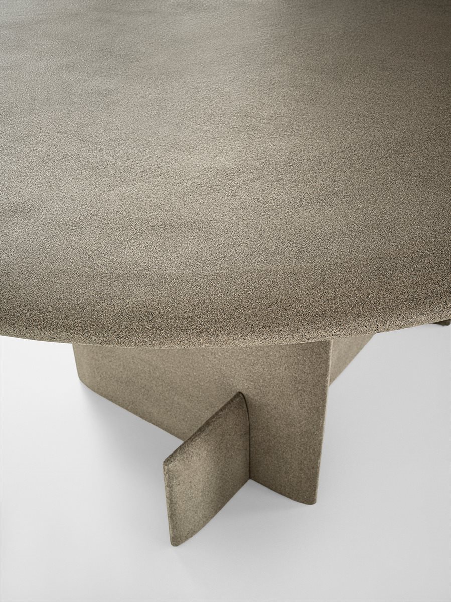 Tavolo realizzato applicando polvere di pietre naturali attraverso una tecnica di spatolatura manuale. Disponibile nei colori "bruciato" e "crema". Trattandosi di una miscela di pietre naturali polverizzate, non si garantisce un’uniformità nelle tonalità cromatiche.