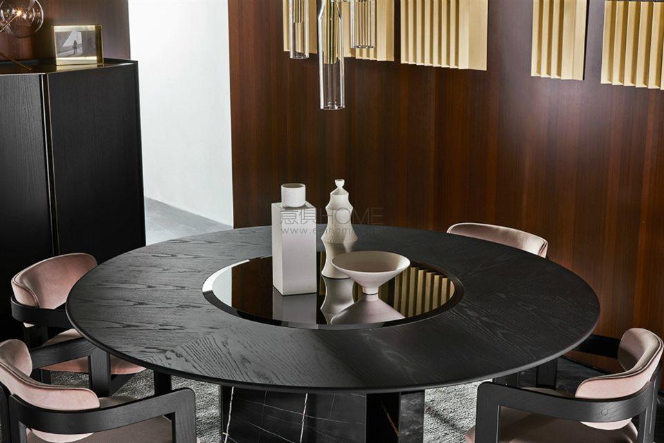 Table with black stained brushed ash top. Rotating lazy susan in 10mm tempered bevelled black bright painted glass. Sahara Noir marble base. Supermirror" bright stainless steel bottom plate.
