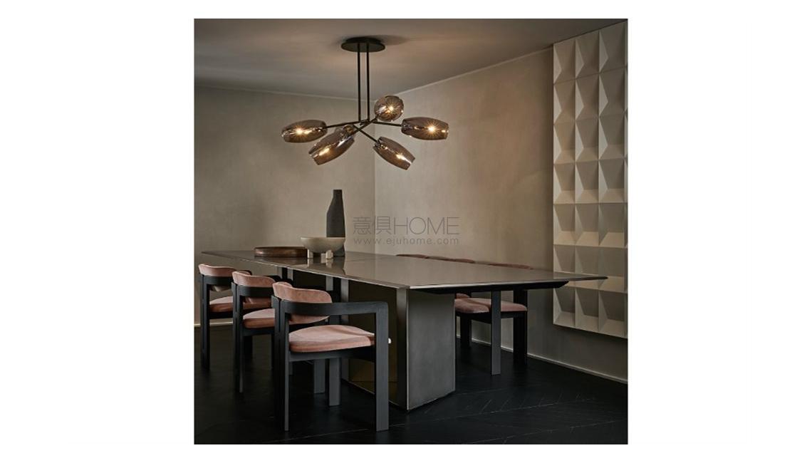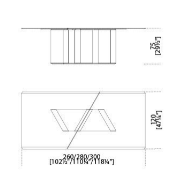 Table with 15mm modular glass top decorated by hand with an exclusive finish antique bronze/ lead. Large bevel of 4cms on the two sides. Wooden base covered by 6mm glass. “Supermirror”bright stainless steel bottom plate. Available also with bright or satin black painted glass top and with base covered by 20mm Sahara Noir marble.