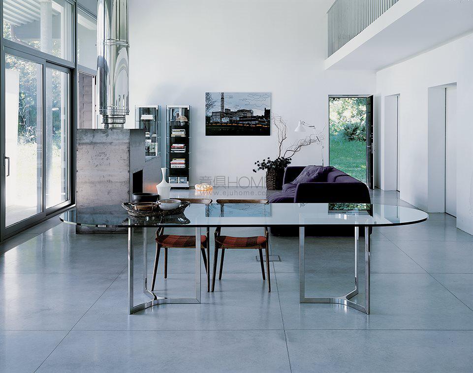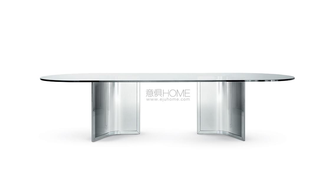 Raj Table with transparent glass top, available oval or rectangular shape. Bright stainless steel base with bright steel insert. Chromed aluminium central part. Raj Light Table with transparent glass top. Bright stainless steel base. Chromed aluminium central part.