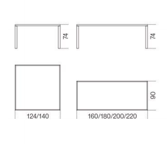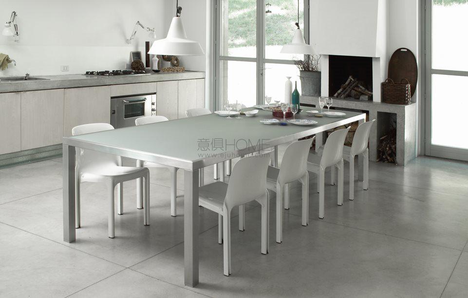 Table with structure in bright stainless steel. Available also in satin stainless steel. 12 mm painted glass top as per samples, in the bright or satin version.
