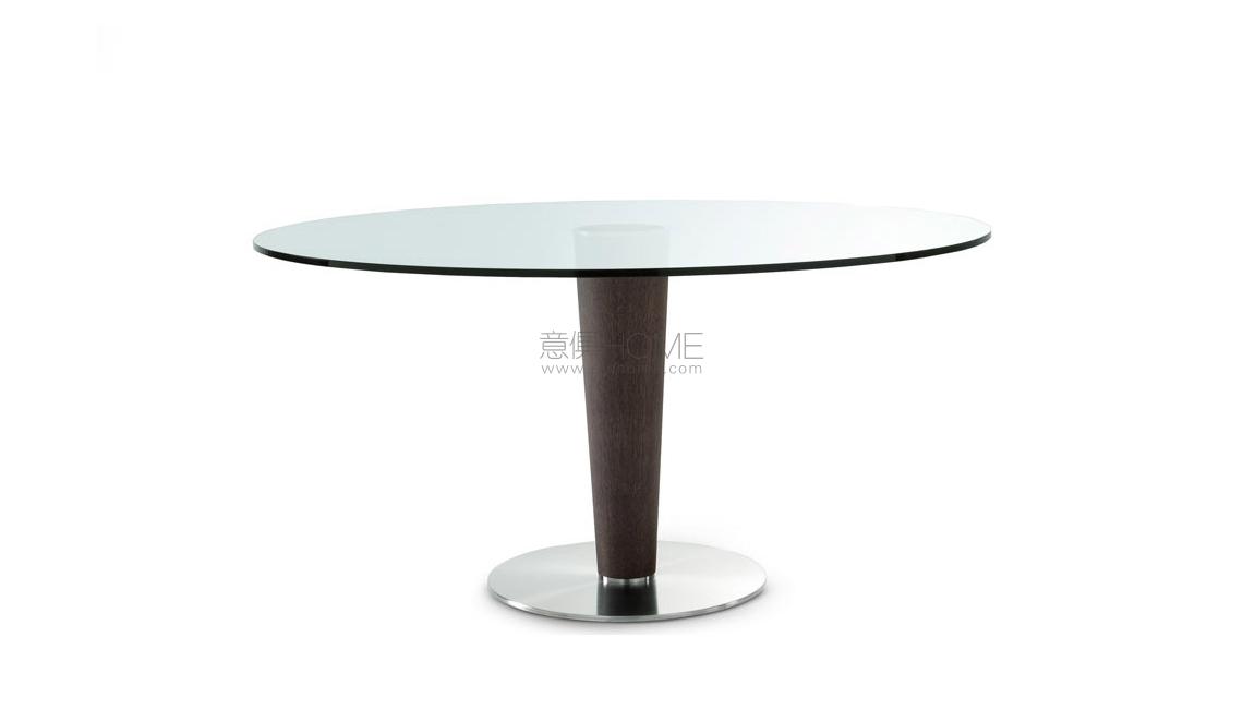 Table with 15 mm transparent tempered glass top. Base in whitened oak, wengé stained or tobacco stained. Available also white, dark grey, black or lacquered with “fabric” touch effect in the colours chestnut, sand and canapa. Metal parts in satin stainless steel.