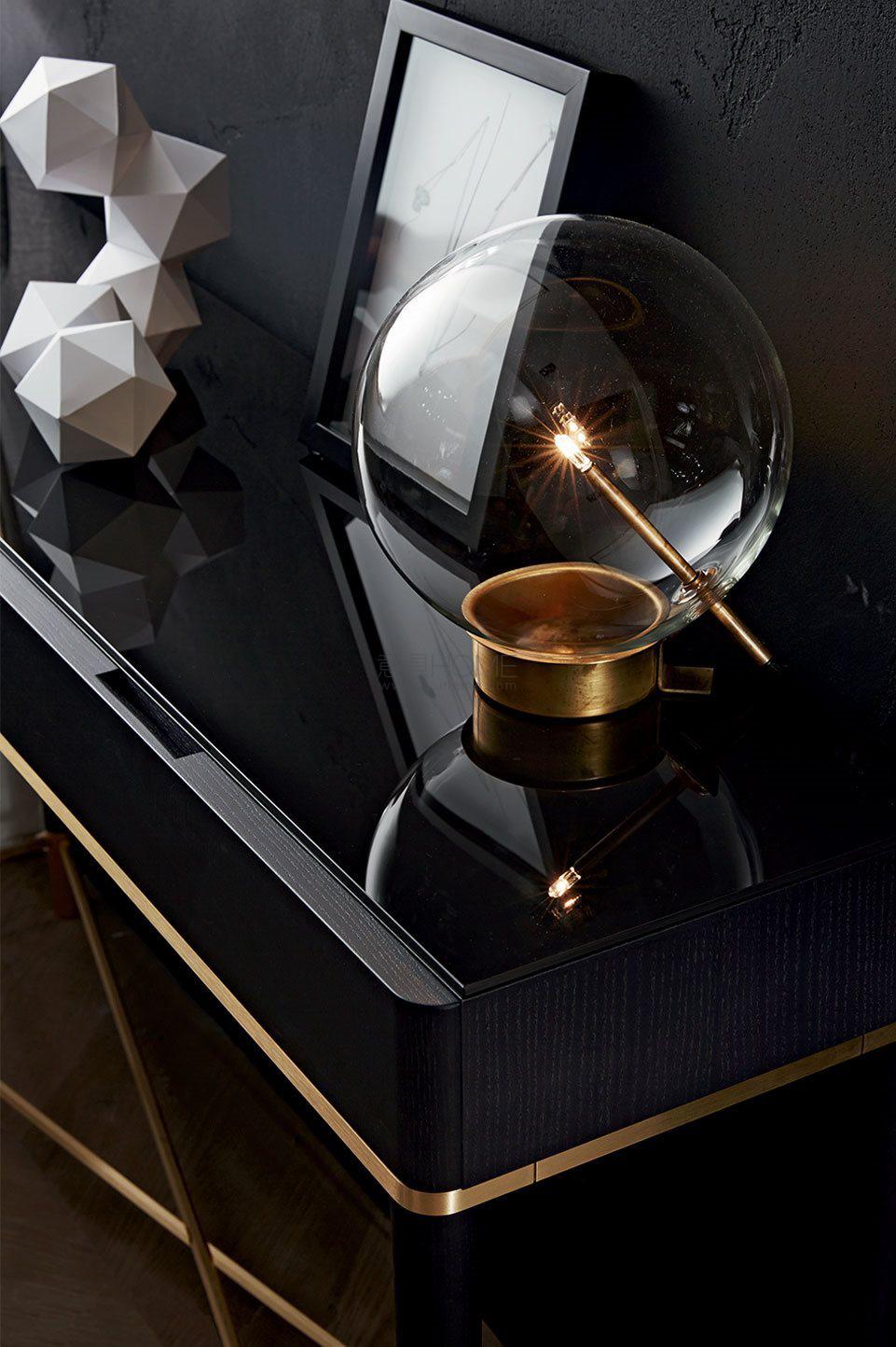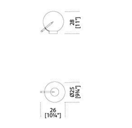Single table lamp with LED point light (G4 2700 Kelvin). Transparent blown glass sphere. Metal parts in hand burnished brass. The hand burnished brass finish looks naturally spotted and irregular. Due to this craftmade processing, each product is unique and exclusive. Not dimmable light.