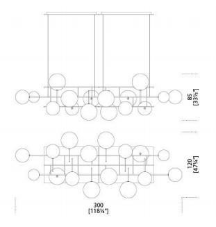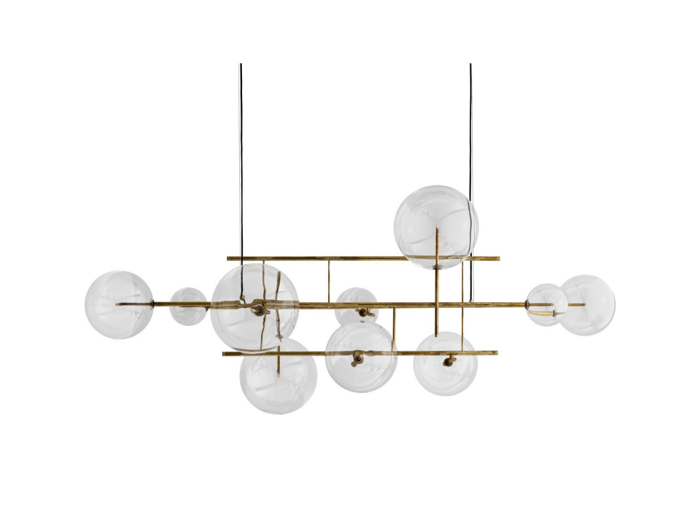 Hanging lamp with dimmable LED light (G4 2700 Kelvin). 10 (A) or 16 (B) transparent blown glass spheres. Metal parts in hand burnished brass. The hand burnished brass finish looks naturally spotted and irregular. Dimmable light. Supplied with cable 4mt long.