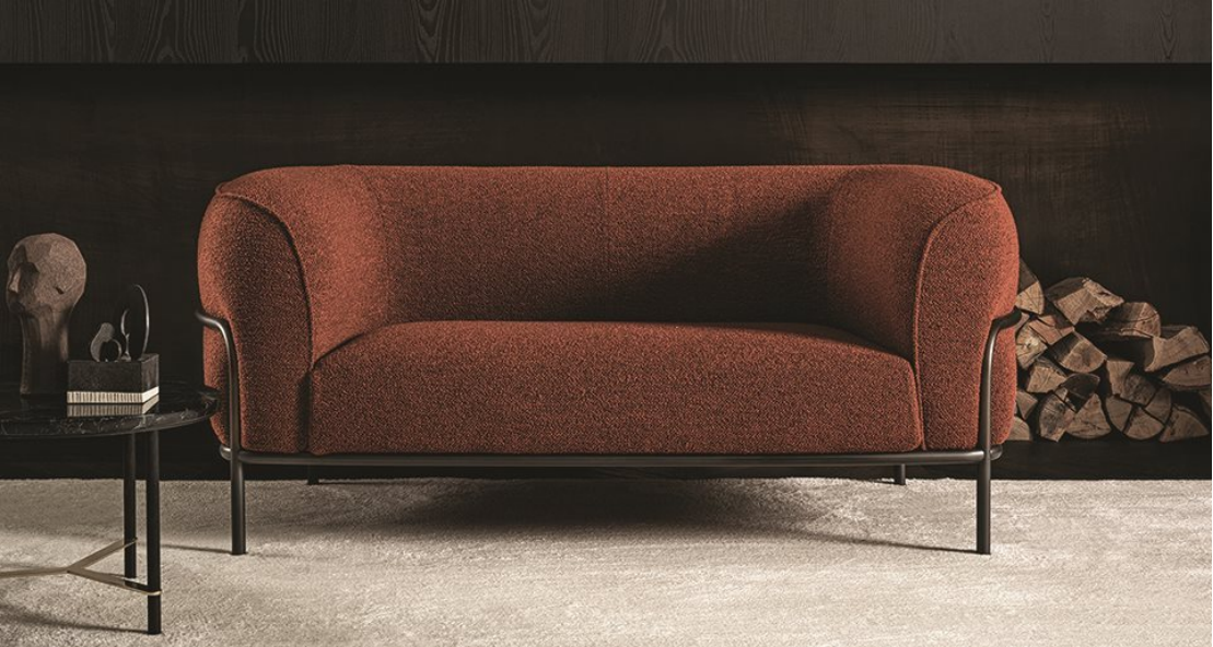 Small sofa with foam polyurethane padding. Cover in fabric or leather, available as per samples. Metal structure in Satin brass or anthracite grey lacquered metal structure.