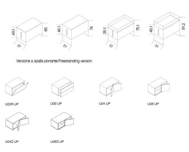 Modular system of wooden elements covered by painted glass as per samples in the bright or satin version or in extralight mirror. Smoked "grigio Italia" mirror for suspended version and for the units U06, U06R only. Available as freestanding version with 12mm tempered extralight transparent glass side or suspended version. For compositions as a room divider is available a painted glass back. Bright anodised aluminium metal parts. The inside of Air Unit is made of leather effect laminated wood.