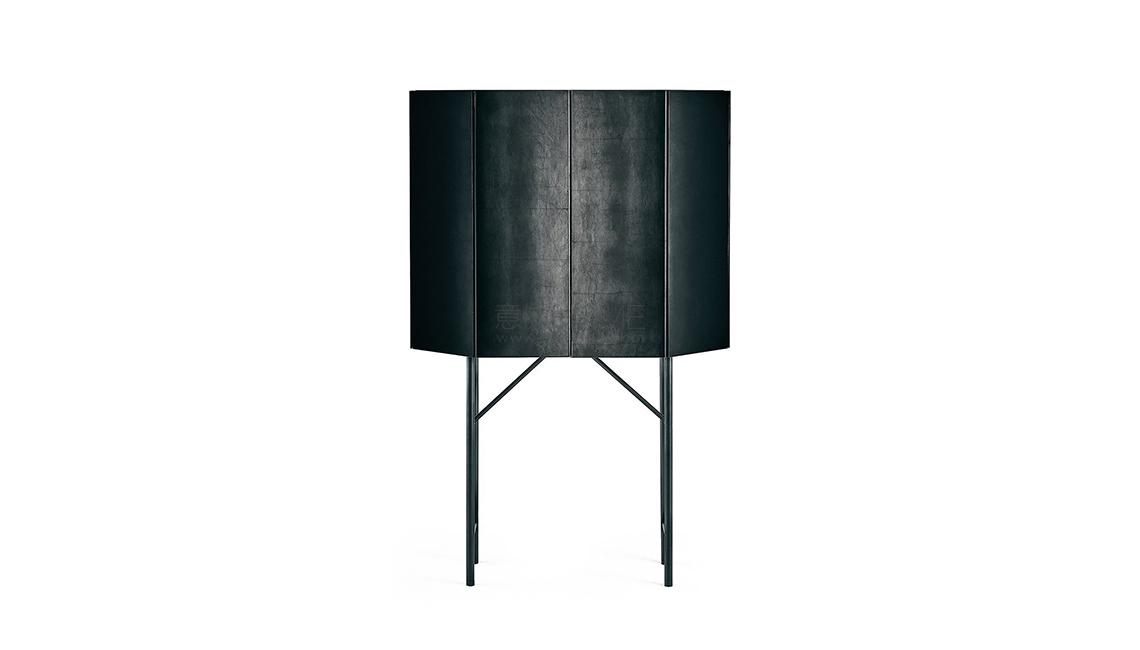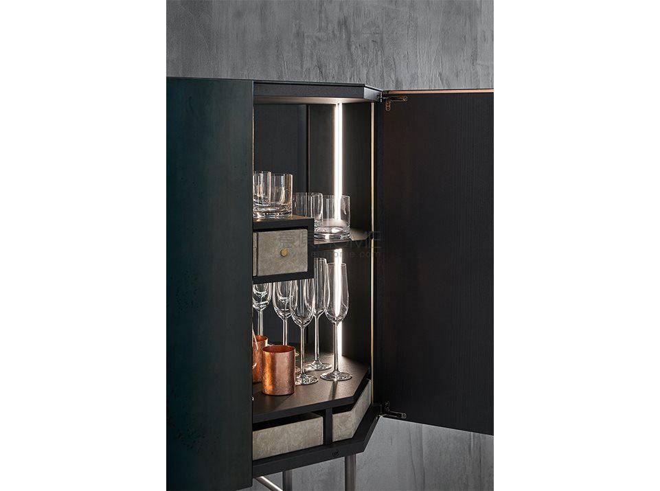 Black open pore lacquered ash wooden bar unit covered by 6mm tempered glass decorated by hand with an exclusive treatment. Patinated bronze lacquered base. Supplied with inside shelves and mirrored glass back. Small boxes in metal covered by suede Sand 06. With light. Collection in numbered edition. This finish is the result of manual oxidation and colouring of copper leaf.