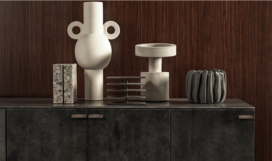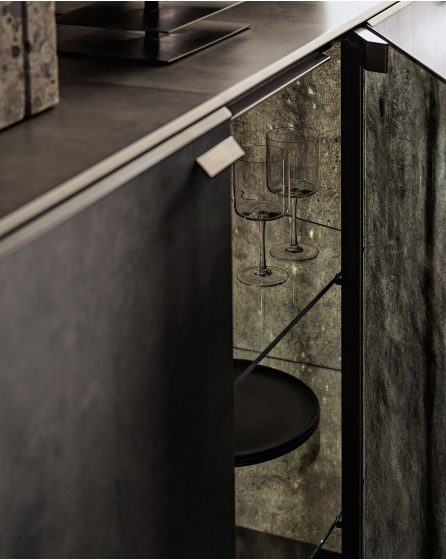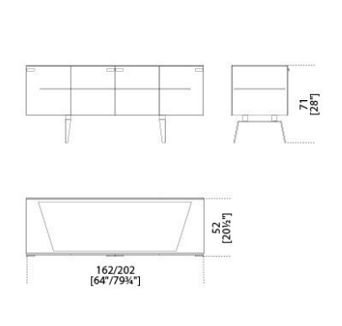 Sideboard in 8mm tempered glass covered by goat skin parchment. Due to the characteristic of the parchment each piece is unique and exclusive. Patinated bronze lacquered metal structure and wooden base. Collection in numbered edition.