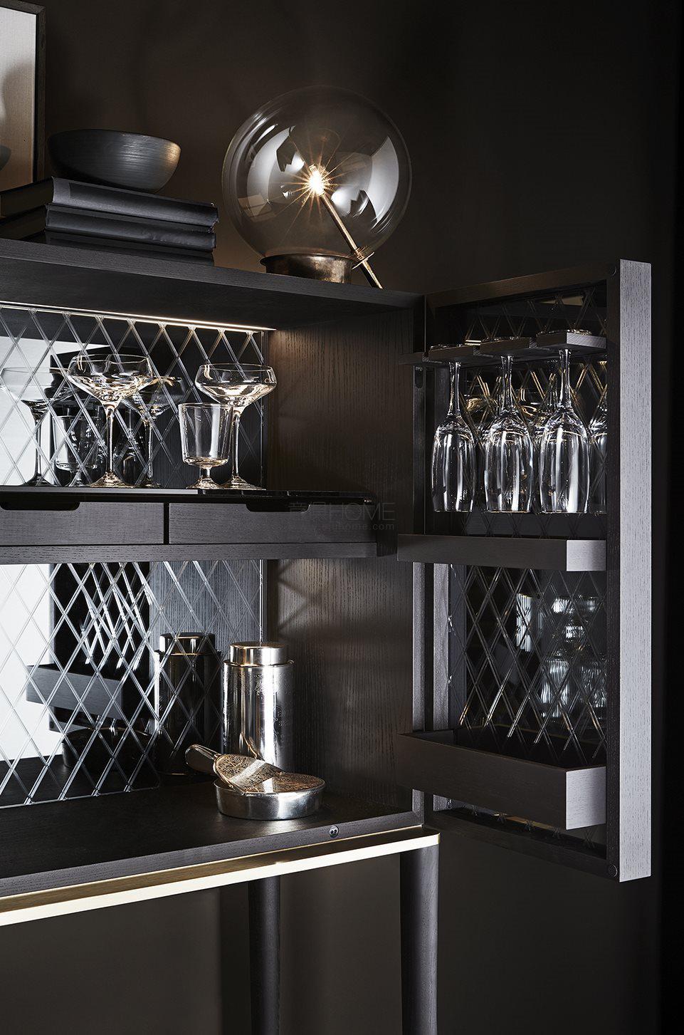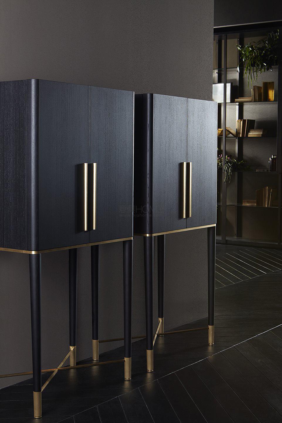 Black (mod. Layer) lacquered ash wooden bar unit and satin brass details. Inside covered with engraved smoked “grigio Italia” mirror. With light.