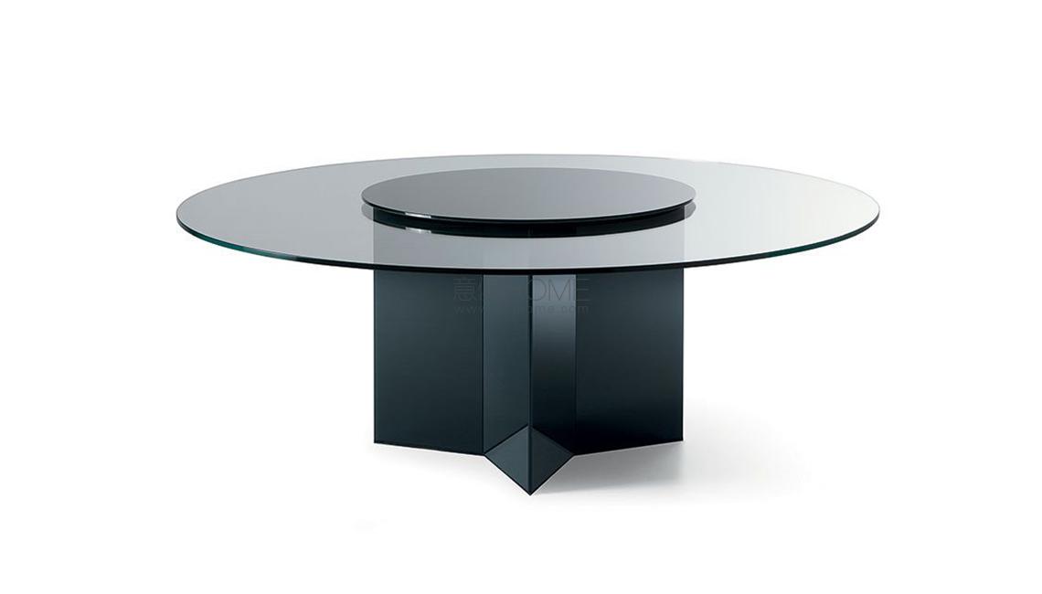 Table with 15mm extralight glass top. In the middle of the top rotating plate in 10mm bright painted glass as per samples. Wooden base covered by painted glass.