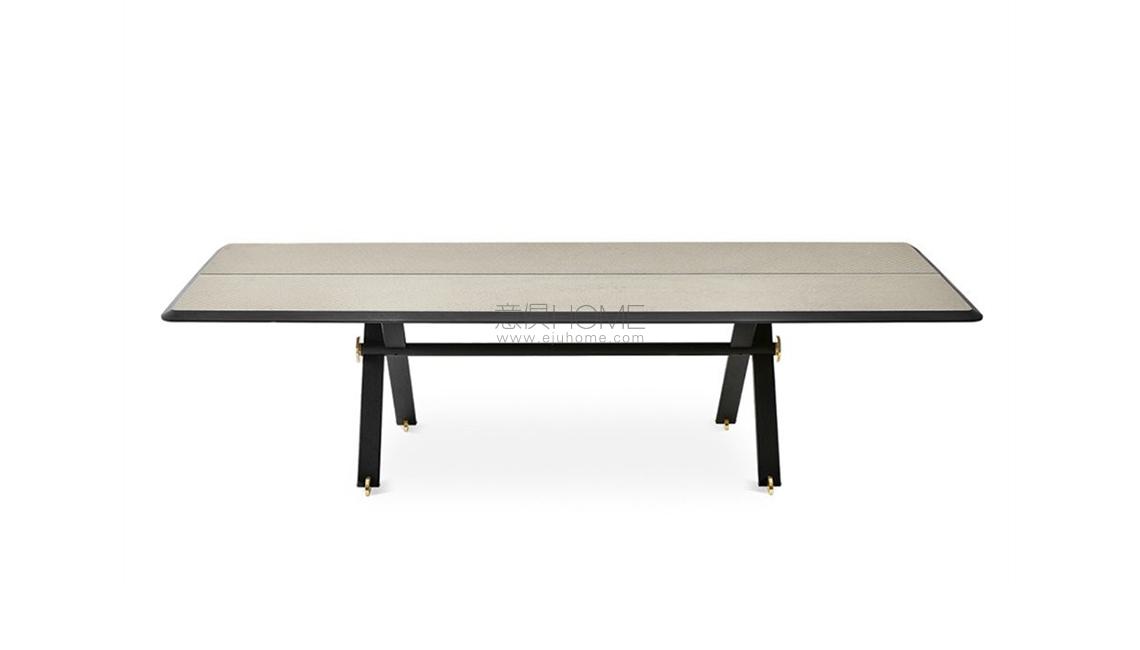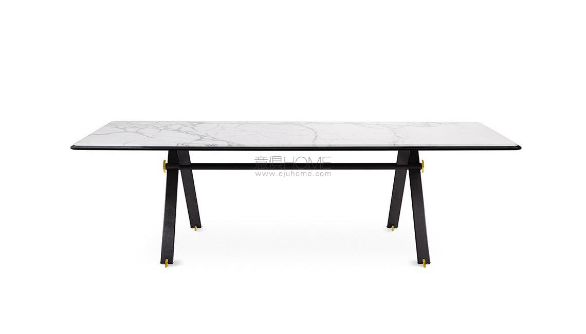 Table with black hand brushed anodised aluminium structure. Bright brass details. Inlaid wooden top with “Tweed” pattern. Available also in Bianco Statuario and Nero Marquinia marble laminated bevelled top. 15mm painted bevelled glass top as per samples in the bright or satin version, on request.
