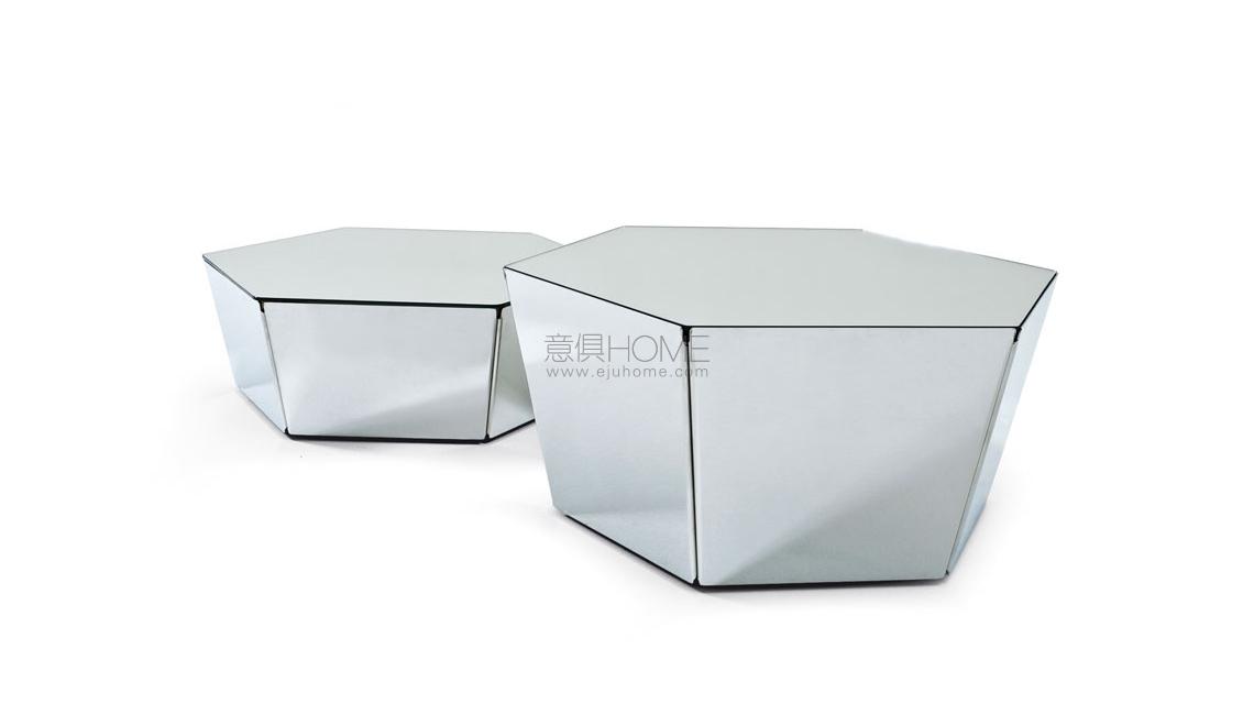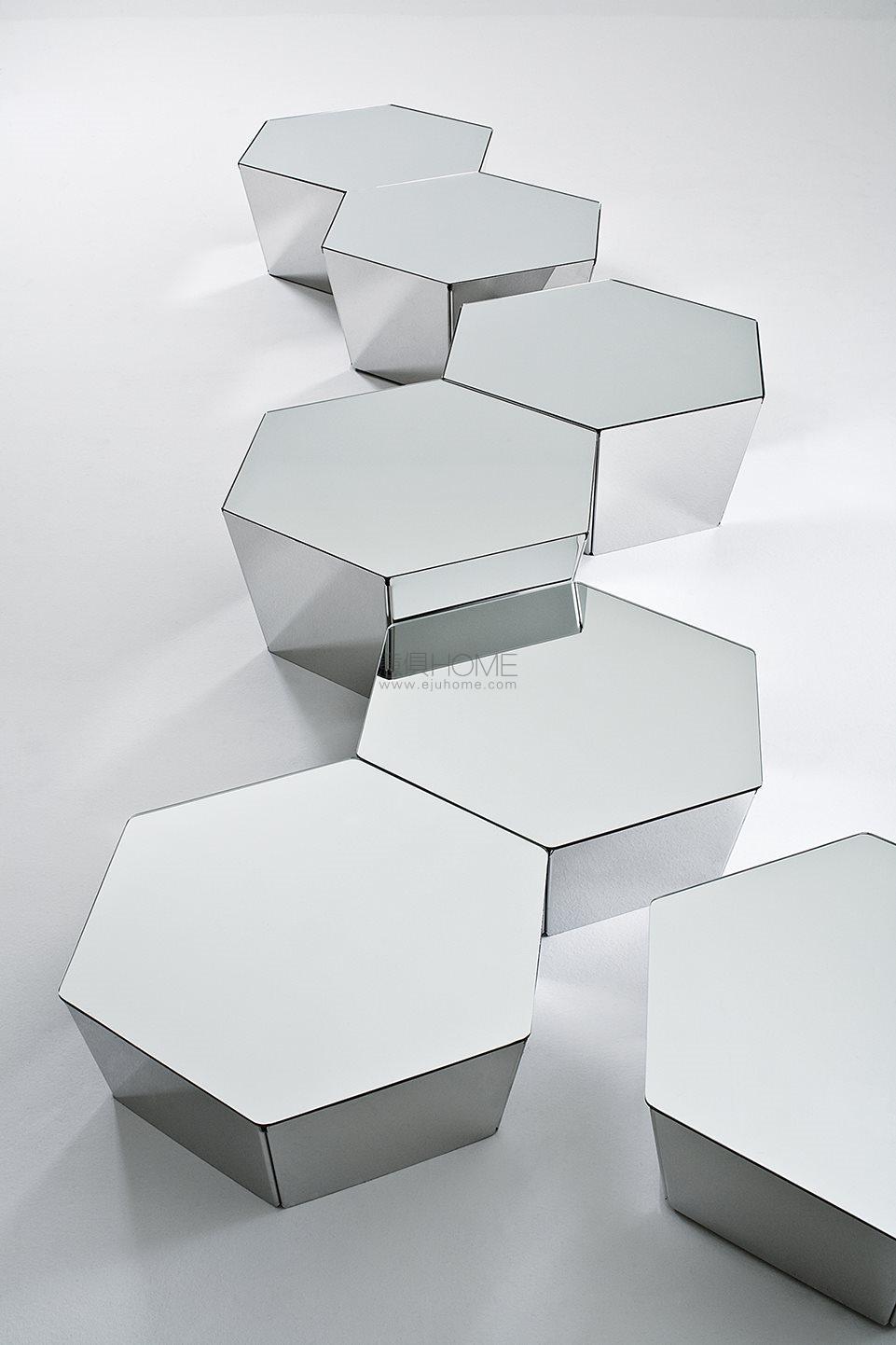 Coffee table to be placed side by side, with hexagonal conic metal base available in different versions: A “Supermirror” bright stainless steel structure with mirrored glass top. B Embossed white lacquered aluminium structure and bright white painted glass top. C Embossed black lacquered aluminium structure and bright black painted glass top. D Brass lacquered metal structure and bright brass top. On castors.