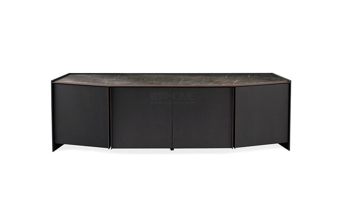 Sideboard in black open pore lacquered ash. Patinated bronze lacquered metal details. Bright black painted glass top. Available also in Grey Stardust or Sahara Noir marble top. Supplied with 10mm tempered extralight inside glass shelf. Push-pull drawers with suede bottom.