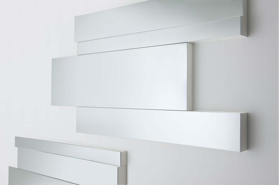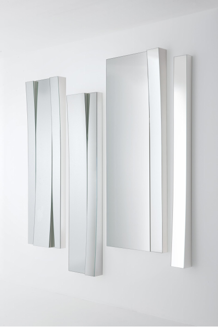 Modular system of concave (A and B) and regular (C) mirrors. + White lacquered wooden frame (max thickness 10 cm). They can be placed in a vertical or horizontal position both upwards and downwards.