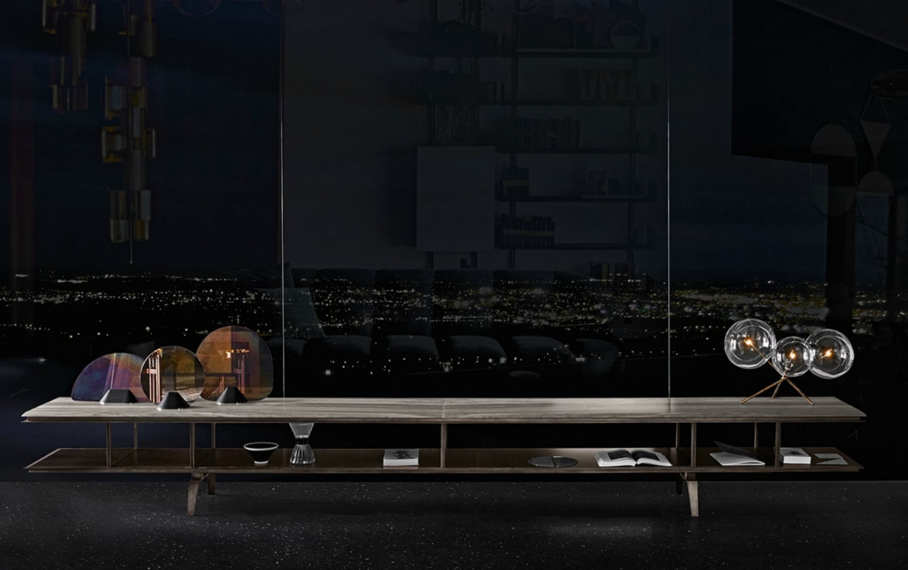 Table mirror. Hand silver-plated and antiqued. Black (mod. Layer) open pore lacquered ash wooden base and bright brass.