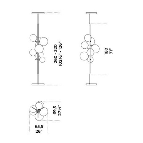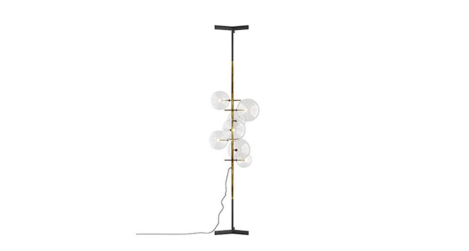 Lampada telescopica terra-soffitto a luce LED dimmerabile dotata di 7 sfere in cristallo trasparente soffiato a bocca. Struttura del corpo luce in ottone brunito a mano. Parte telescopica in metallo brunito scuro. Altezza regolabile da 260 a 320cm con sistema di fissaggio a soffitto.