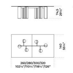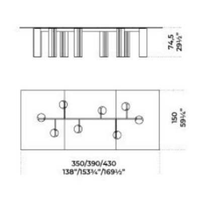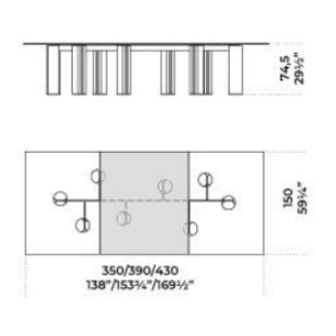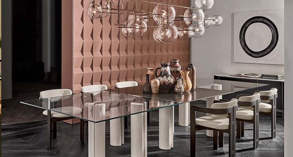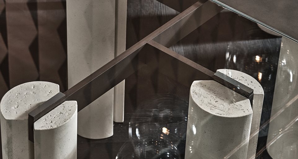 Tavolo con piano in cristallo 12mm temperato, disponibile in extralight, “Grigio Italia” o verniciato nella finitura esclusiva bronzo antico o piombo. Basi in cemento alleggerito color avorio o carbone. Parti metalliche in metallo laccato color fango.
