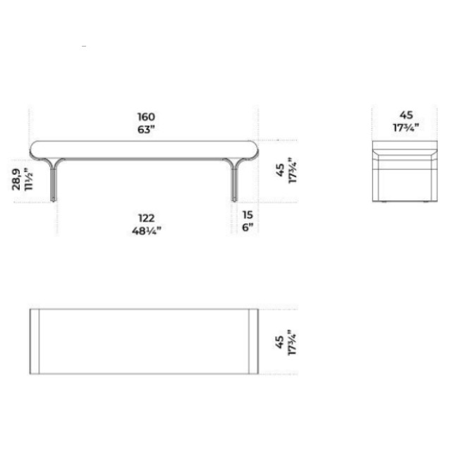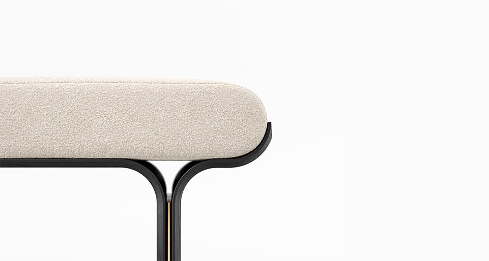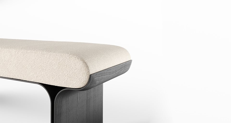 Panca con base in frassino curvato tinto nero poro aperto e dettagli in ottone lucido. Cuscino in poliuretano espanso rivestito in tessuto o pelle nei colori del campionario. Rivestimento sfoderabile.