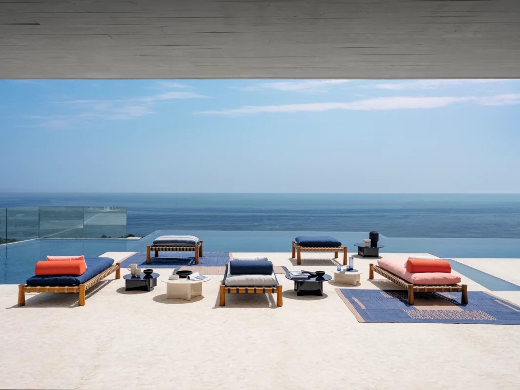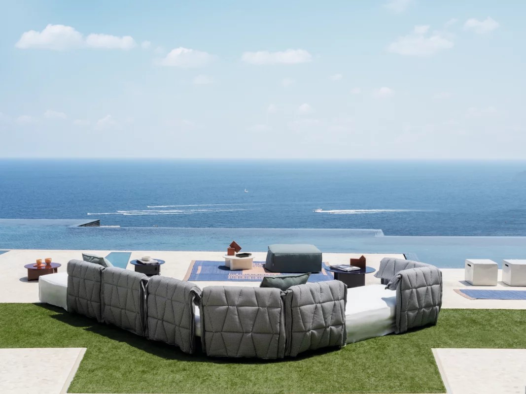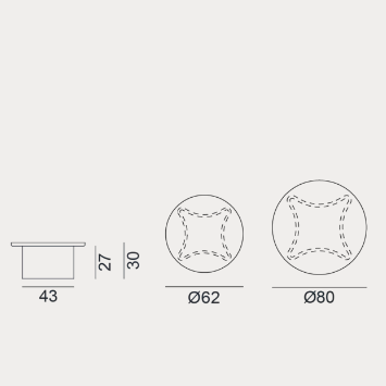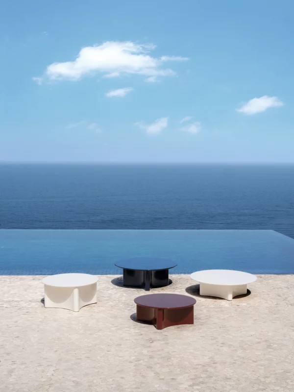 Tavolini bassi, con top tondo con base scultorea in Millgres nei colori Rosso, Bianco e blue.