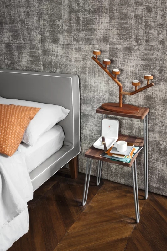Il tavolino-comodino LC 48 è espressione di grande leggerezza visiva, grazie alle gambe in tondino d’acciaio verniciato bianco o grigio finitura opaca che sembrano disegnare delle onde, unite al noce Canaletto naturale, nero, bianco, grigio, oceano o tortora del top. Due ripiani di diverse dimensioni in legno e di forma rettangolare, uno più alto e uno più basso, aumentano le possibilità di spazio di questo complemento d’arredo.