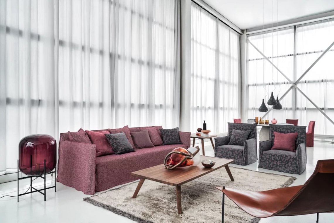 Le poltrone della famiglia Ghost hanno schienali con altezze differenti e sedute di varie dimensioni, hanno una struttura minimale e sottile imbottita in poliuretano espanso e cuscini volanti in misto piuma. La caratteristica principale delle poltrone Ghost è il rivestimento sfoderabile, una housse oversize il cui profilo è sottolineato dalle cuciture a vista, che permette ai prodotti di svestirsi e rivestirsi in un baleno. Si tratta di un progetto tessile che cambia facilmente volto, permettendo di passare da un look elegante ad uno informale con facilità e velocità.
