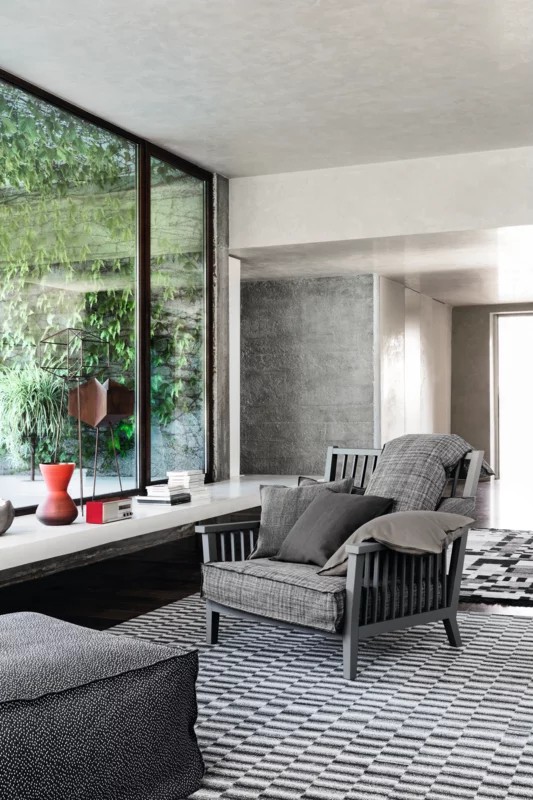 Poltrona lounge con struttura in legno, Gray 01 è caratterizzata da linee squadrate ed essenziali. Il contrasto tra la solidità degli ampi listelli e la morbidezza dei cuscini volanti, conferisce al prodotto un piacevole equilibrio visivo. La struttura è realizzata in noce Canaletto verniciato naturale, rovere sbiancato o rovere laccato bianco, grigio, nero, oceano o tortora.