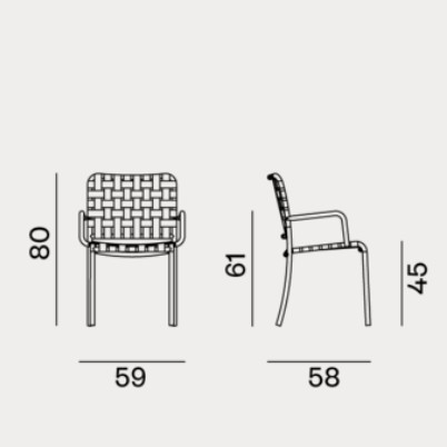 Famiglia di sedie con e senza braccioli, con struttura minimal e linee essenziali, Inout 823/824 si sviluppano attorno ad una leggera struttura in tubolare di alluminio verniciato goffrato Pearl, Slate, Agate e Oxido, materiale ecologico ed unico per qualità tecniche. A questo si aggiunge un particolare intreccio in cinghia elastica grigia, nera, blu o tabacco, un prodotto innovativo a base di gomma sintetica e propilene.
