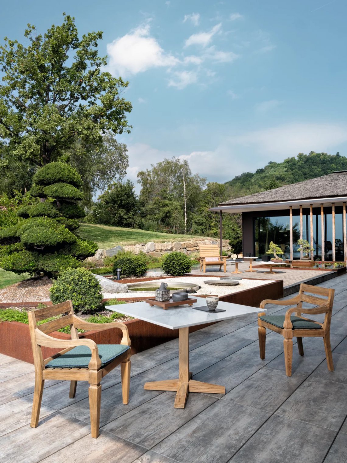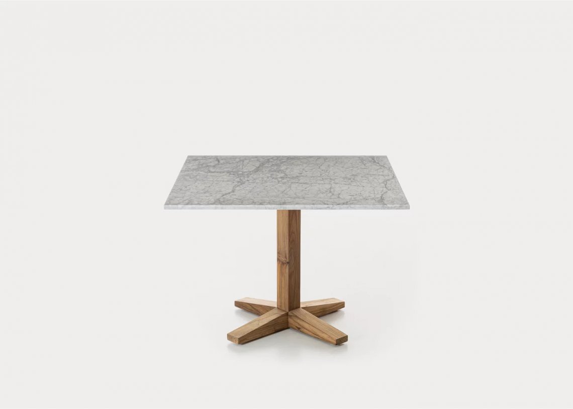 Tavolo in stile coloniale di ispirazione esotica, Jeko 35 ha base e colonna centrale realizzate in ECOTeak, materiale proveniente dal riutilizzo di travi ed elementi in teak recuperati, riparati con legno riciclato, assemblati e levigati per evidenziare le venature. Viene impreziosito da un top in marmo bianco Carrara, così da creare un prodotto che gioca sui contrasti visivi dei due materiali diversi.