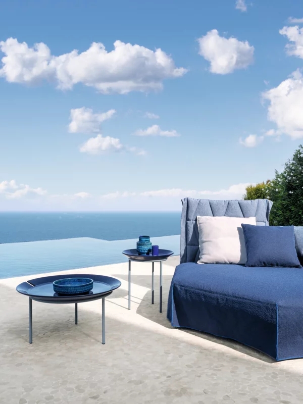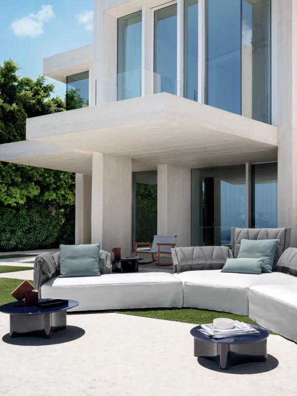 divano componibile outdoor Flair si caratterizza per lo schienale con doppia cerniera ribaltabile manualmente, indipendente per ogni singolo posto e rivestito con un tessuto trapuntato outdoor con dettaglio cucitura taglia e cuci tono su tono o a contrasto. è questo particolare a definire e movimentare lo skyline del prodotto, permettendo di avere doppie altezze sui singoli schienali. La struttura del divano in acciaio trattato per esterni si combina alla morbidezza dei cuscini di seduta in poliuretano espanso a densità variabile e fibre poliestere, rivestiti con telina poliestere outdoor e fondo traspirante antiscivolo.