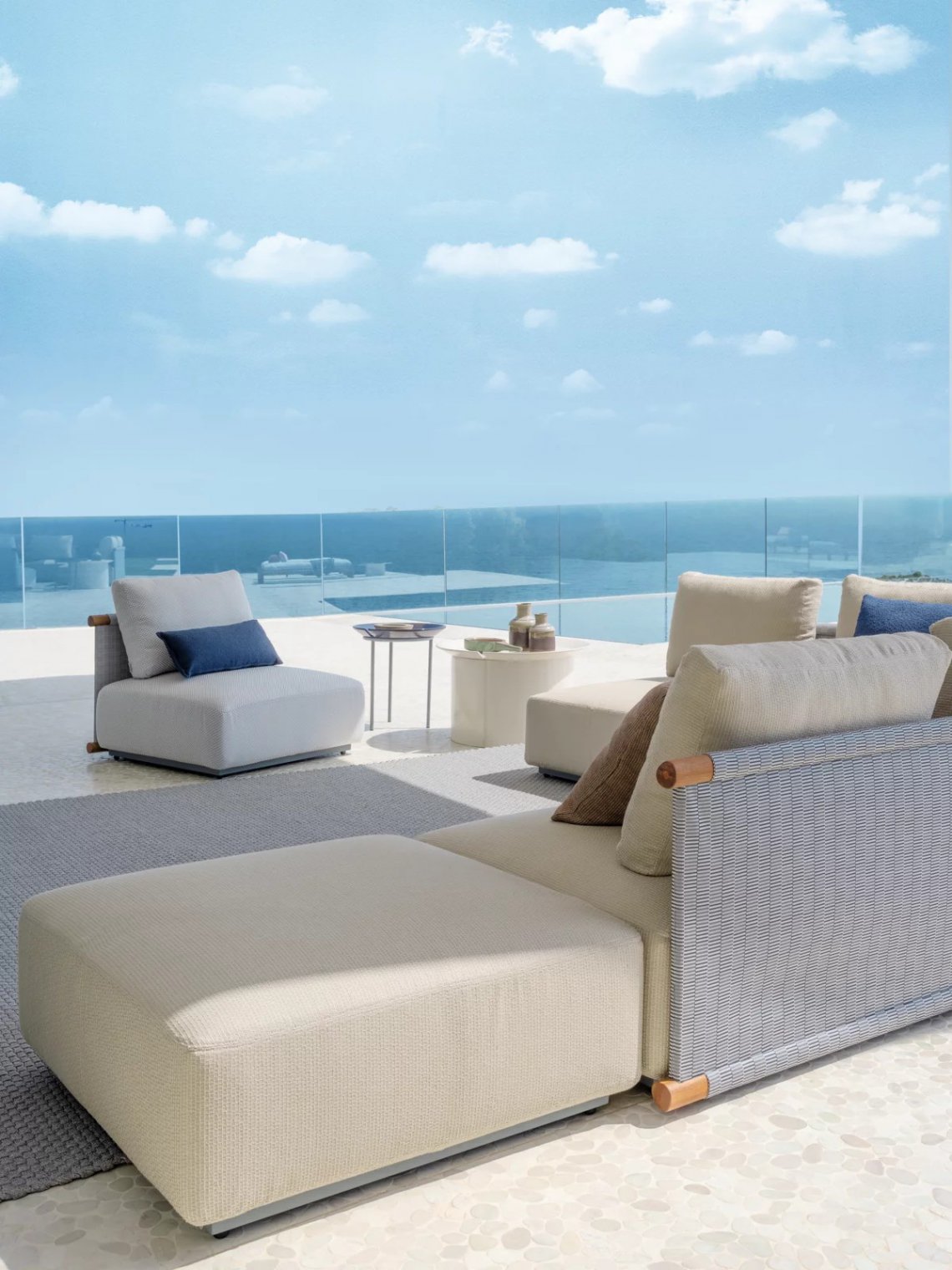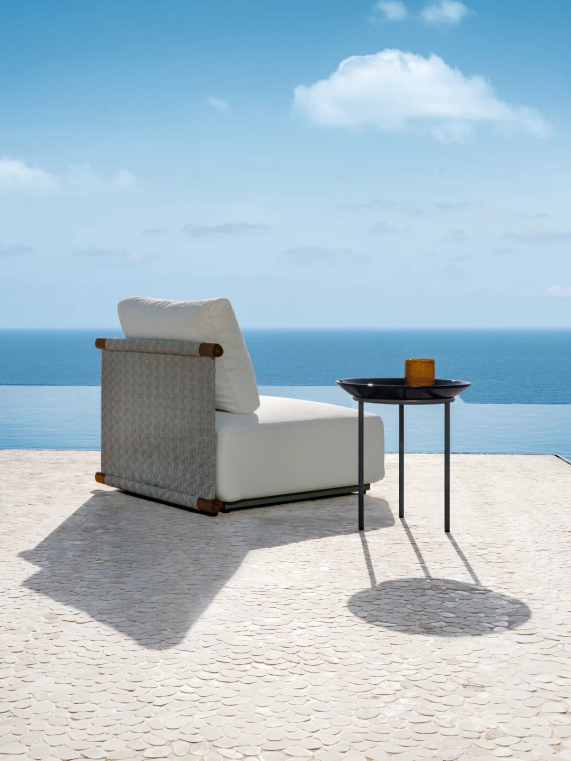 La particolarità di Hashi risiede nell’utilizzo del tessuto tecnico Jaquard Outdoor Accardi che avvolge e fascia inferiormente e superiormente gli elementi in legno iroko. Tessuto sostenibile, leggero ed impermeabile e lavorato attentamente da artigiani tessitori, il tessuto Outdoor Accardi crea un disegno tramato che si sposa armonicamente con la struttura in legno con sezione irregolare, evidenziando ancora una volta il rimando al giapponesismo e alla tradizione artigianale locale.